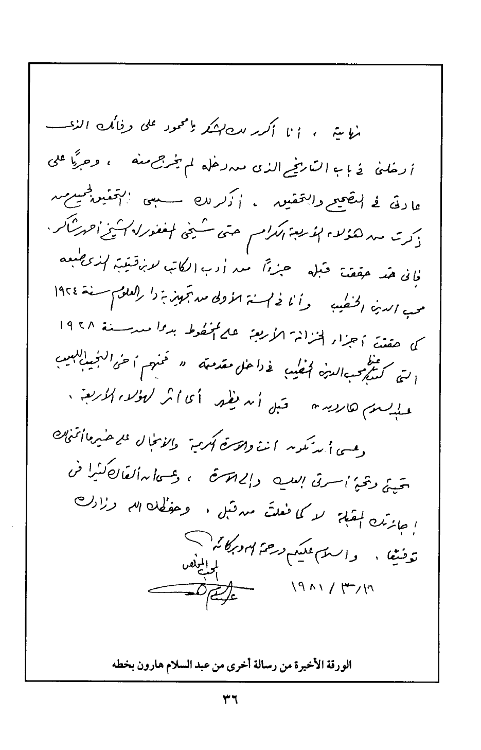 الورقة الأخيرة من رسالة أخرى من عبد السلام هارون بخطه