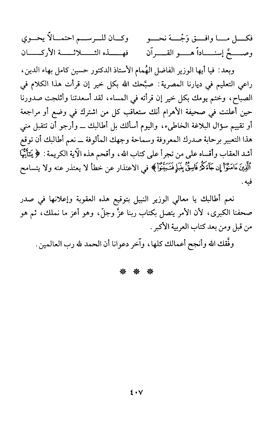 وبعد: فيا ايها الوزير الفاضل الهُمام الأستاذ الدكتور حسين كامل بهاء الدين،