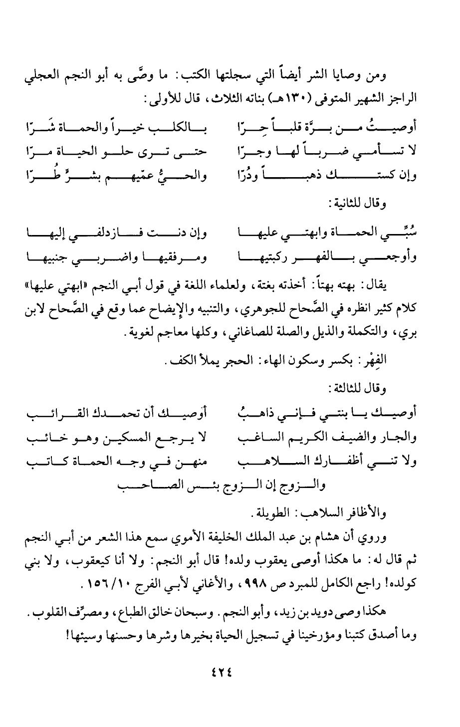 ومن وصايا الشر أيضاًالتي سجلتها الكتب: ما وضَى به ابو النجم العجلي