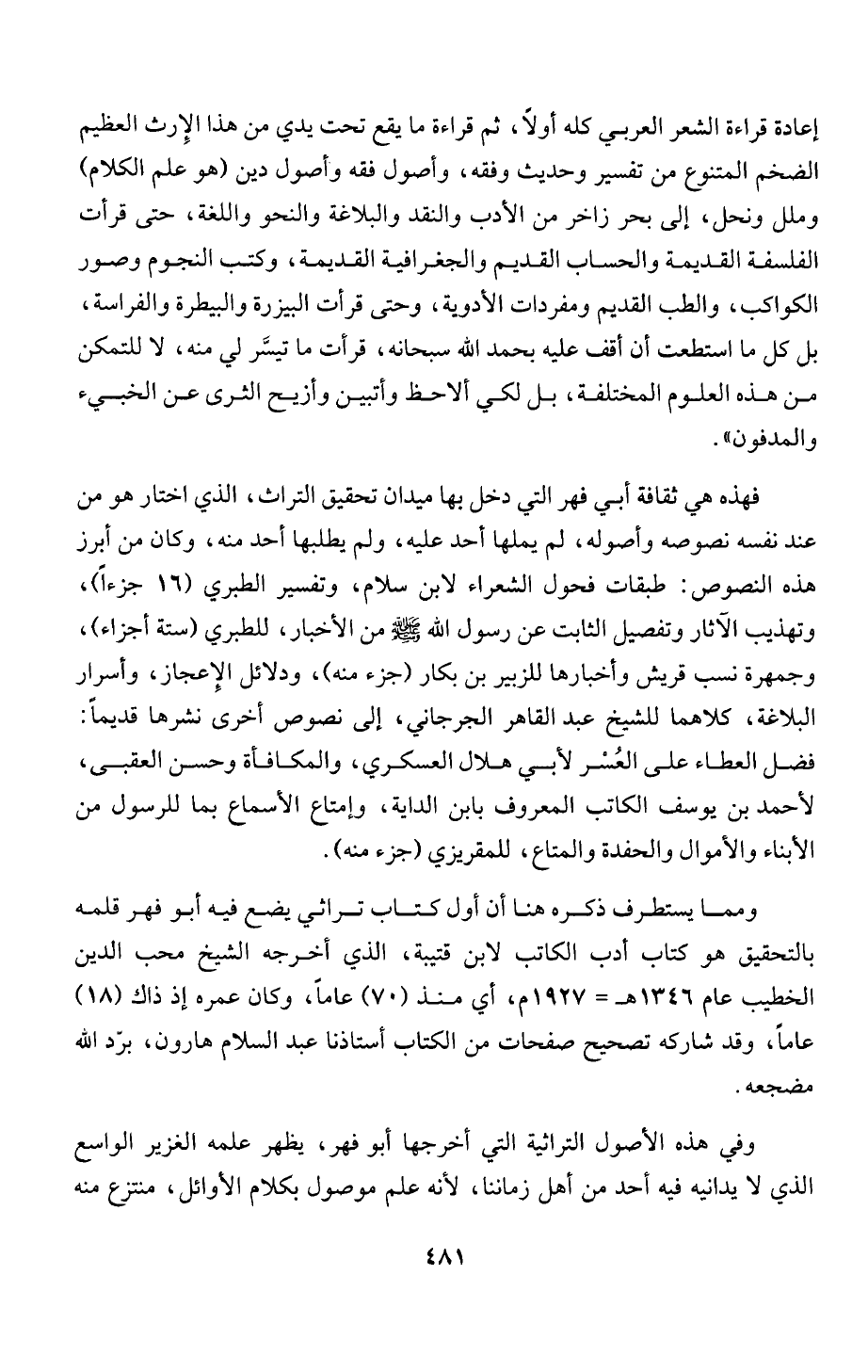 وفي هذه الأصول التراثية التي أخرجها أبو فهر، يظهر علمه الغزير الواسع