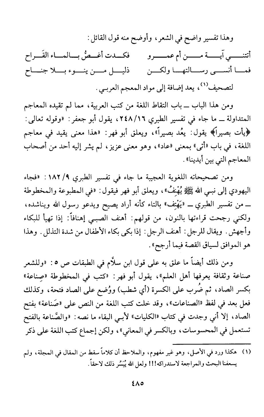 "يأت بصيرا! يقول: يعُد بصيراً"، ويعلق أبو فهر: "هذا معنى يفيد في معاجم