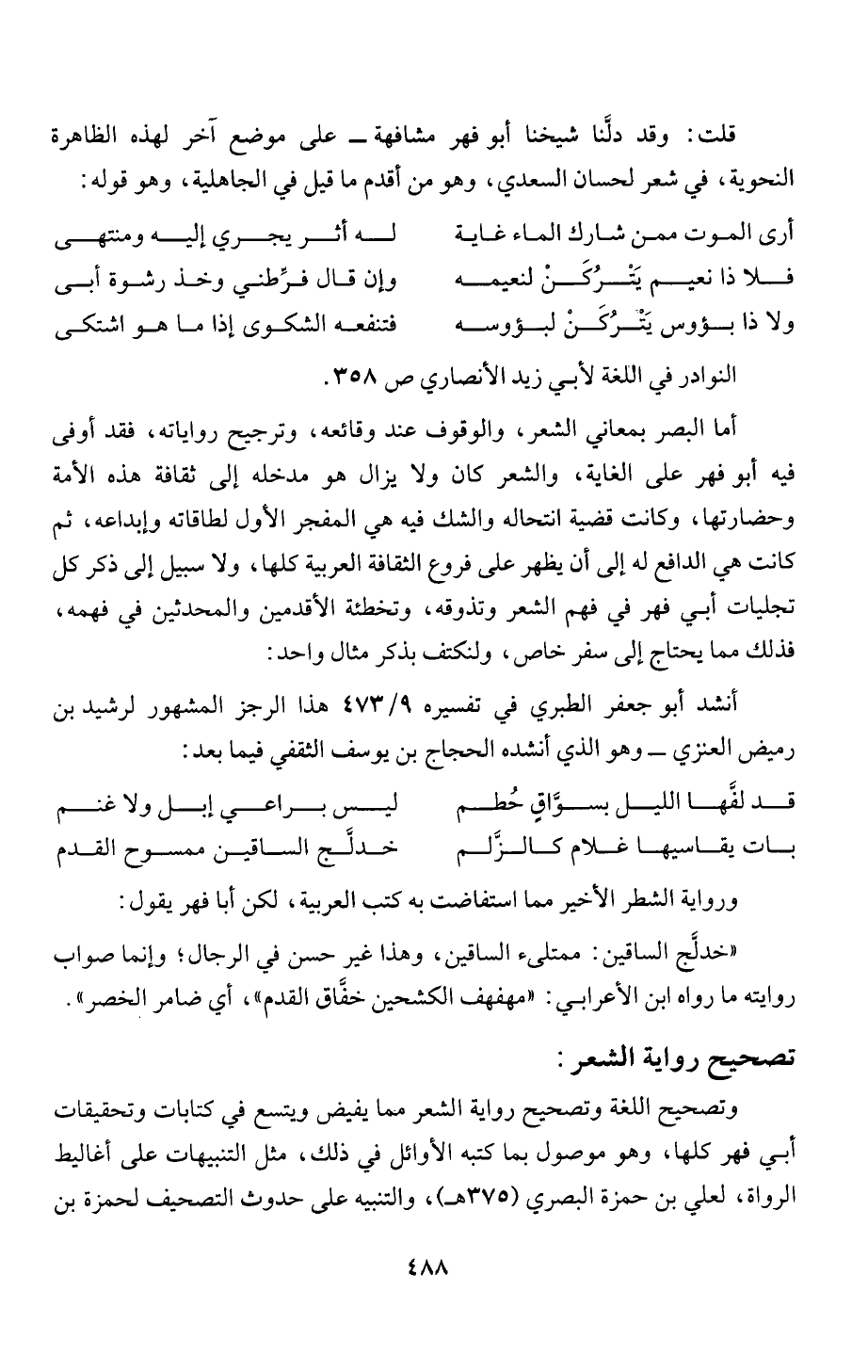 ورواية الشطر الأخير مما استفاضت به كتب العربية، لكن أبا فهر يقول: