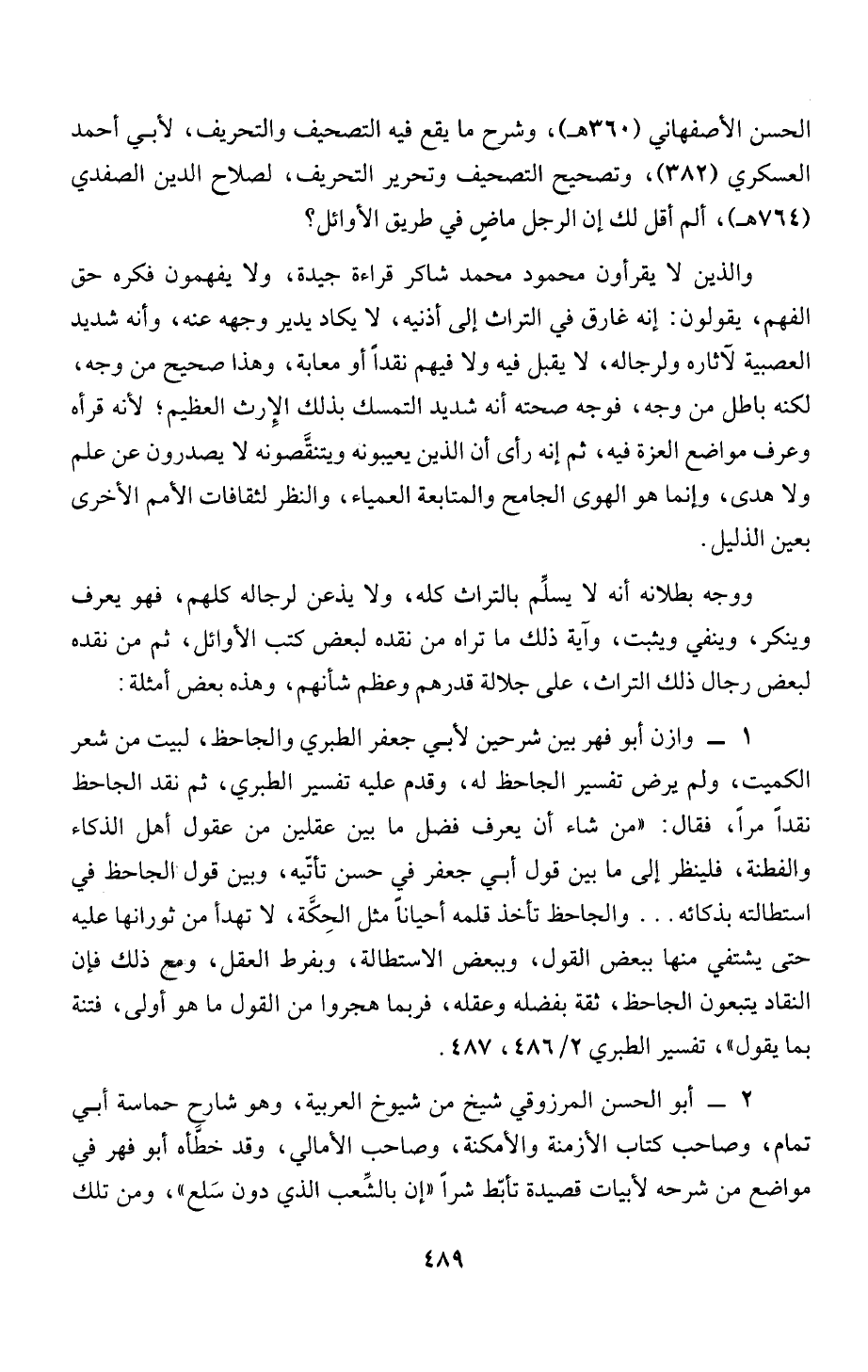 1 - وازن أبو فهر بين شرحين لأبي جعفر الطبري والجاحط، لبيت من شعر