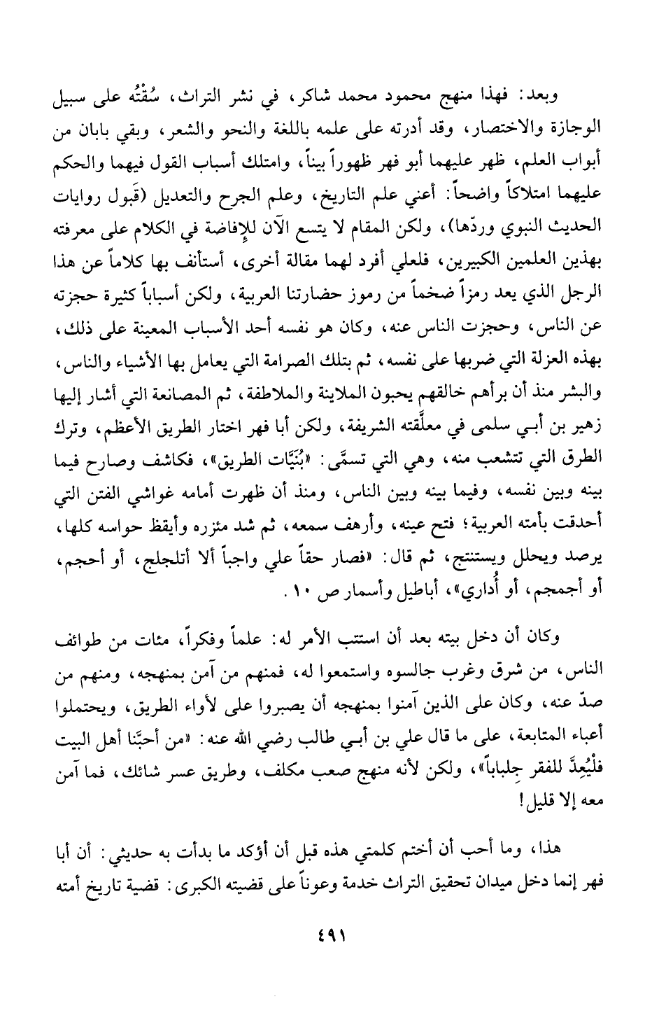 فهر إنما دخل ميدان تحقيق التراث خدمة وعوناً على قضيته الكبرى: قضية تاريخ أمته