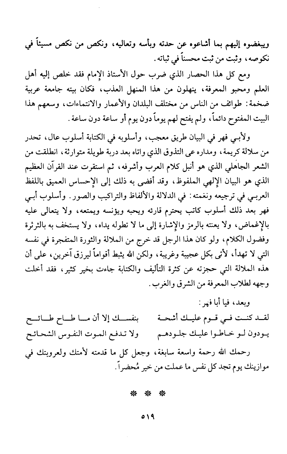 ولأبي فهر في البيان طريق معجب، وأسلوبه في الكتابة أسلوب عال، تحدر