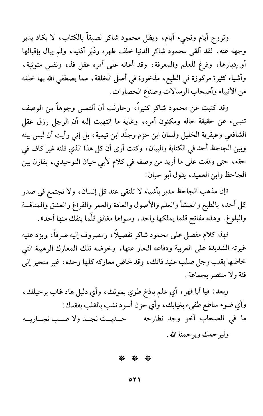 وبعد: فيا أبا فهر، أي علم باذخ طوي بموتك، وأي دليل هاد غاب برحيلك،