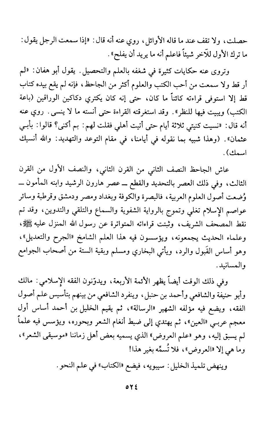 أر قط ولا سمعت من أحب الكتب والعلوم أكثر من الجاحظ، فإنه لم يقع بيده كتاب