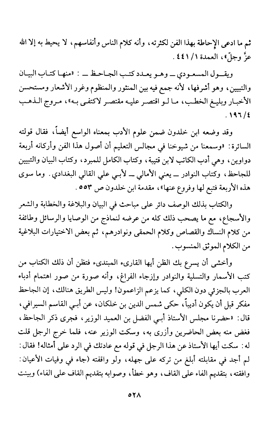 العرب بالجزئي دون الكلي، كما يزعم الزاعمون! وليس الطريق هنالك، إن الجاحظ