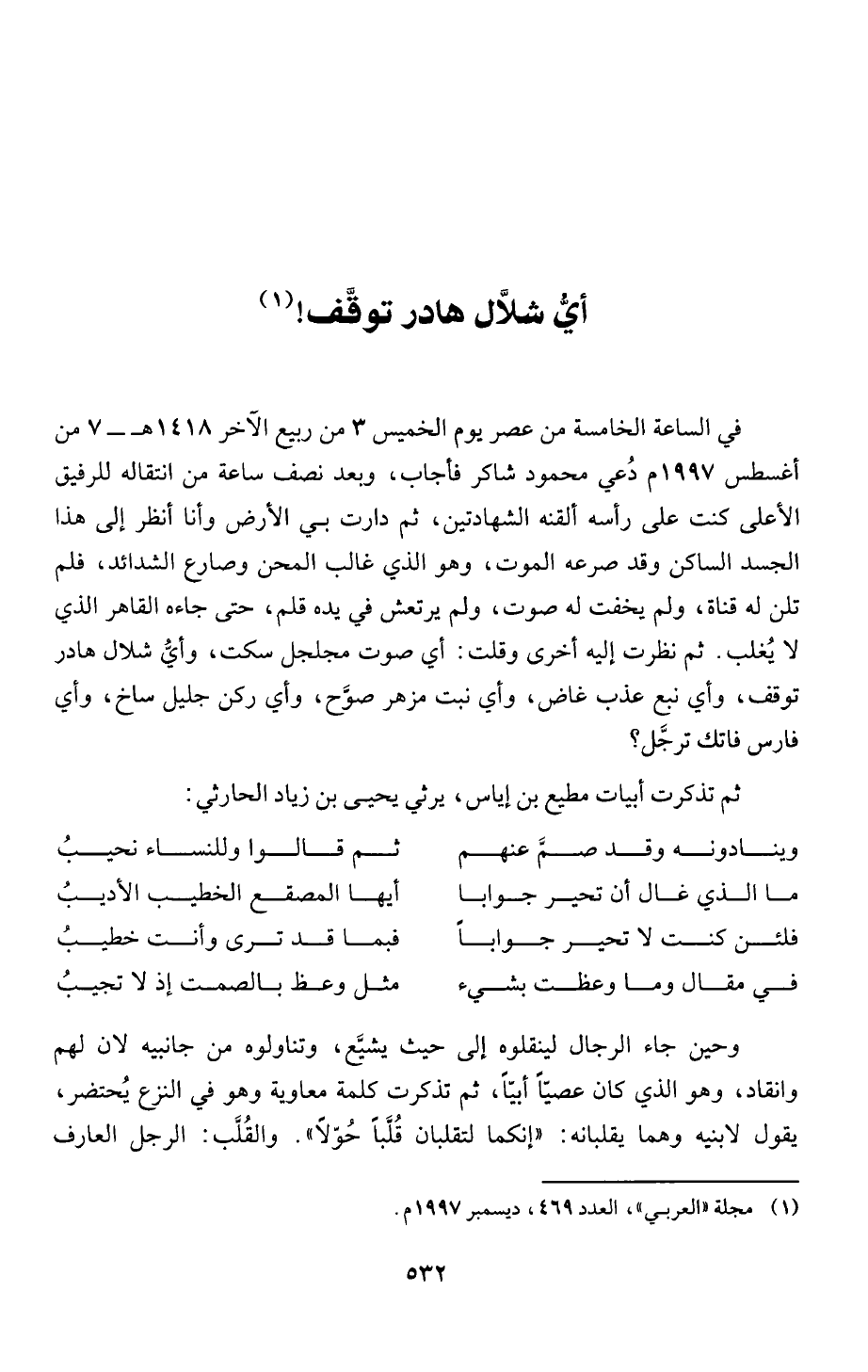 وانقاد، وهو الذي كان عصيّاً أبياَ، ثم تذكرت كلمة معاوية وهو في النزع يُحتضر،