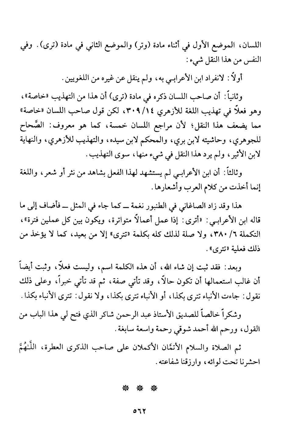 وثانياً: أن صاحب اللسان ذكره في مادة (ترى) أن هذا من التهذيب "خاصة "،