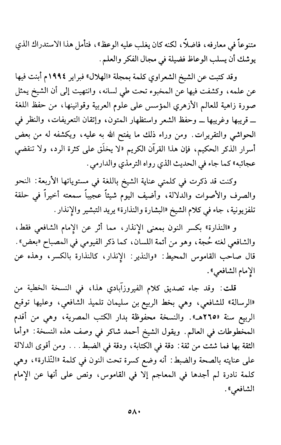 وقد كتبت عن الشيخ الشعراوي كلمة بمجلة "الهلال" فبراير 1994 م أبنت فيها