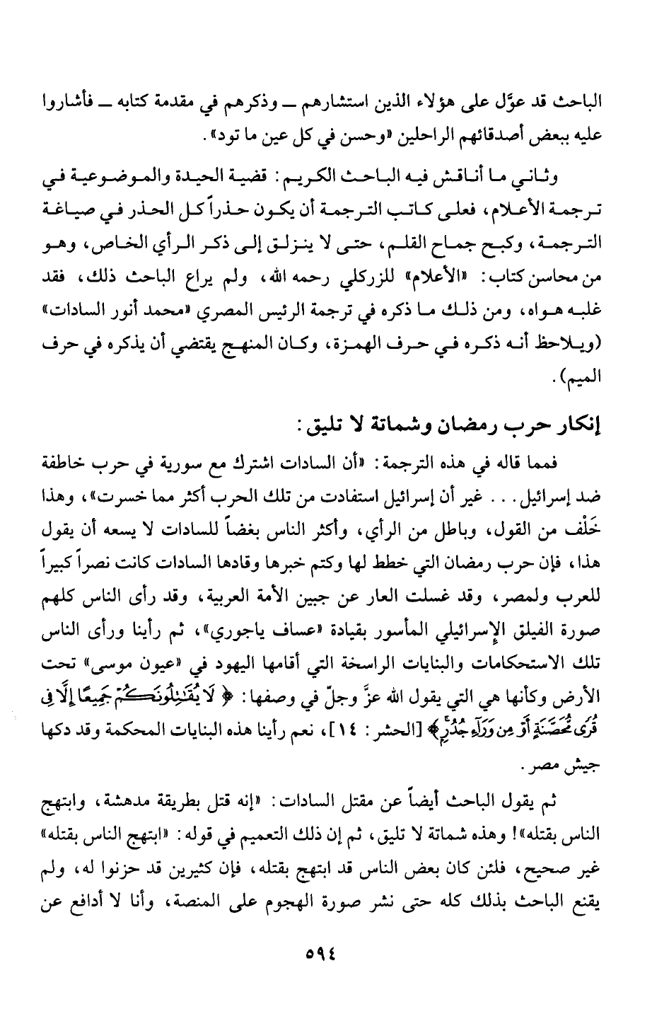 فمما قاله في هذه الترجمة: "ان السادات اشترك مع سورية في حرب خاطفة