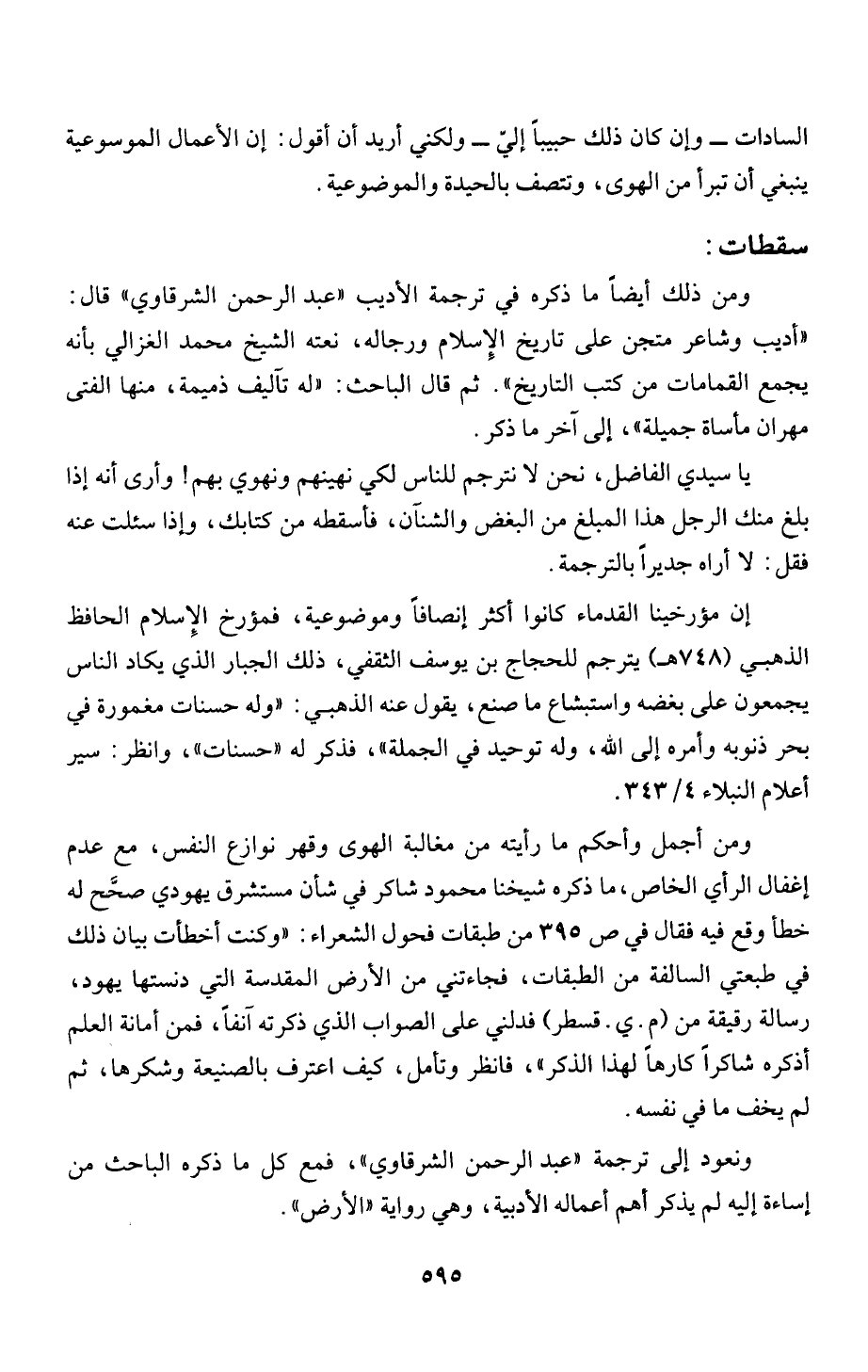 ومن ذلك أيضاَ ما ذكره في ترجمة الأديب "عبد الرحمن الشرقاوي " قال: