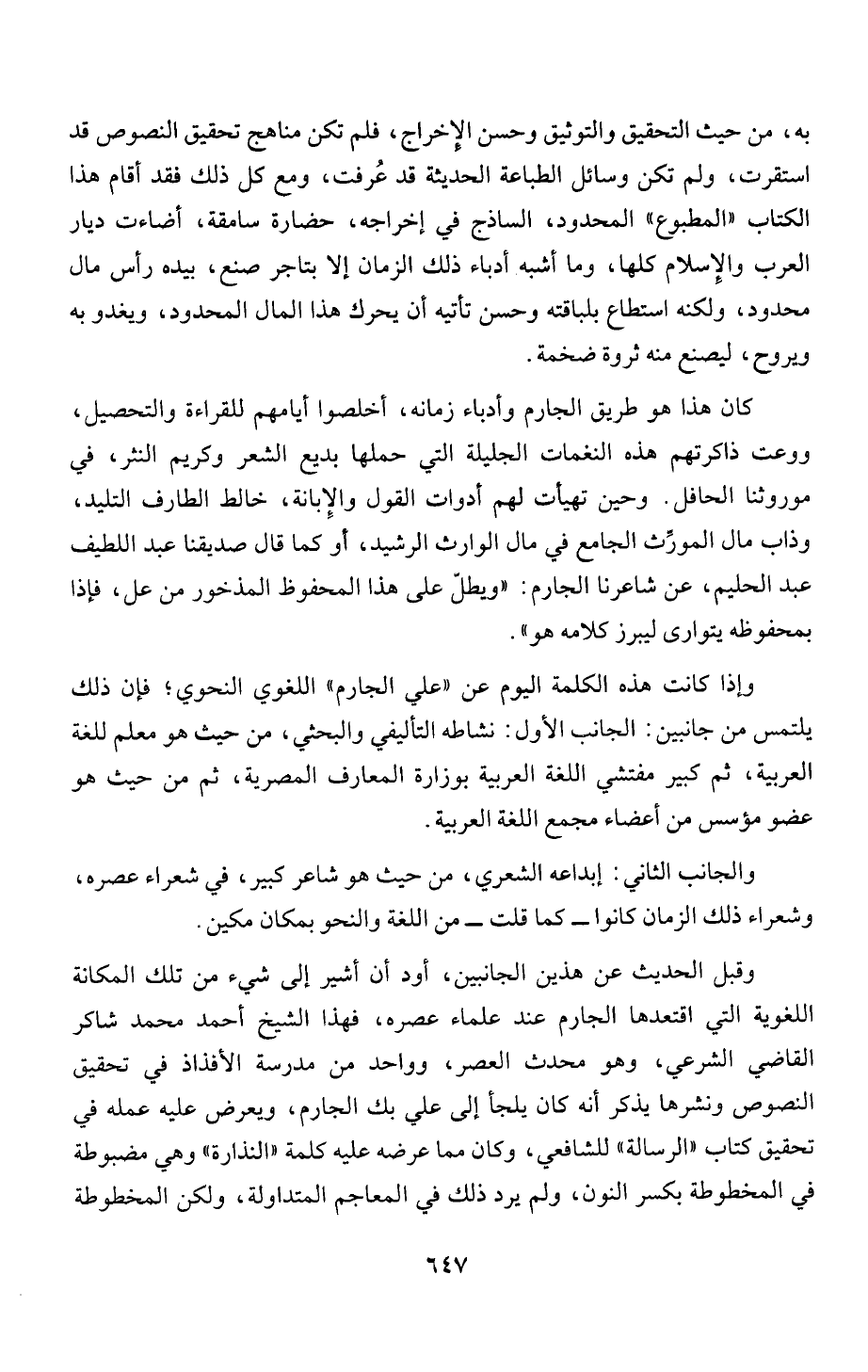 اللغوية التي اقتعدها الجارم عند علماء عصره، فهذا الشيخ احمد محمد شاكر