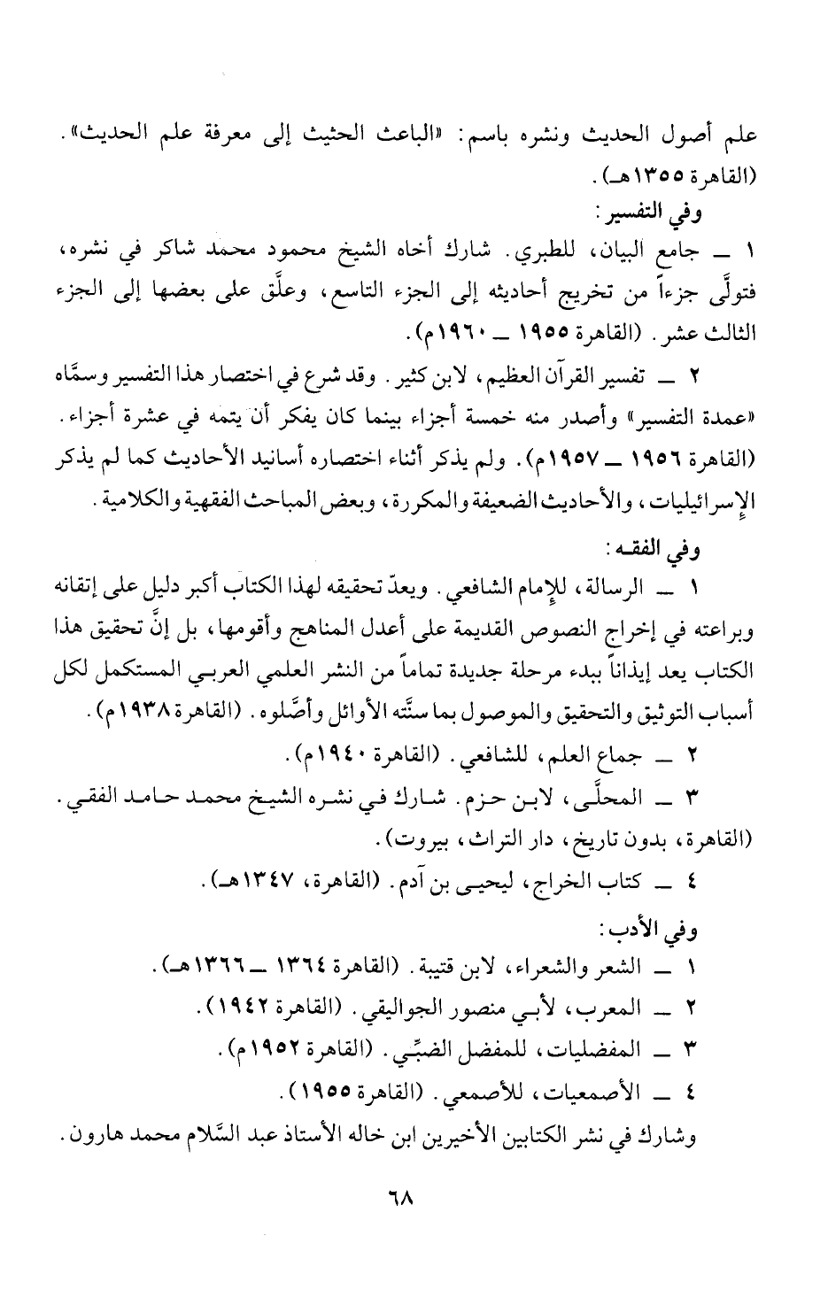 1 - الرسالة، للِإمام الشافعي. ويعدّ تحقيقه لهذا الكتاب أكبر دليل على إتقانه