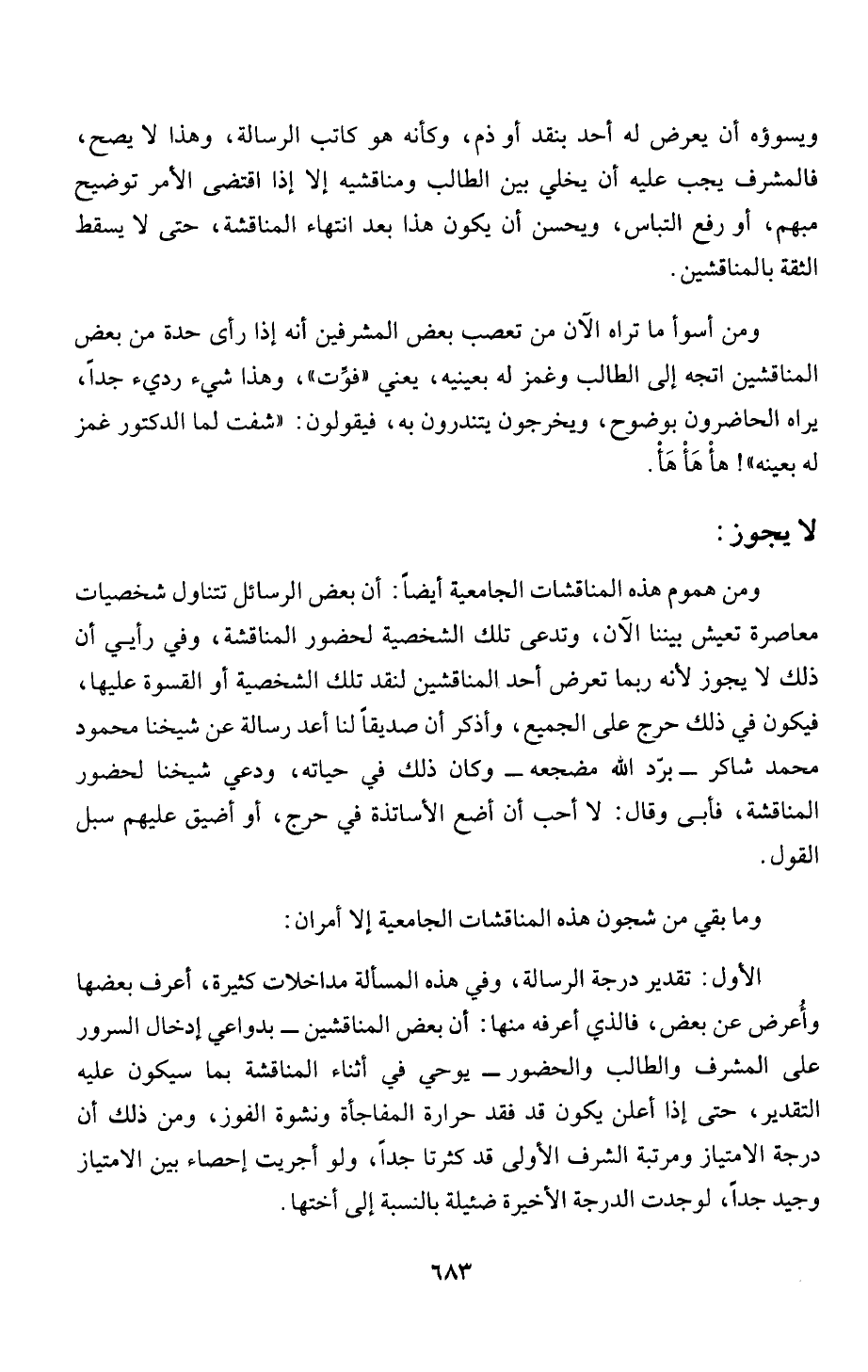 الأول: تفدير درجة الرسالة، وفي هذه المسألة مداخلات كثيرة، أعرف بعضها