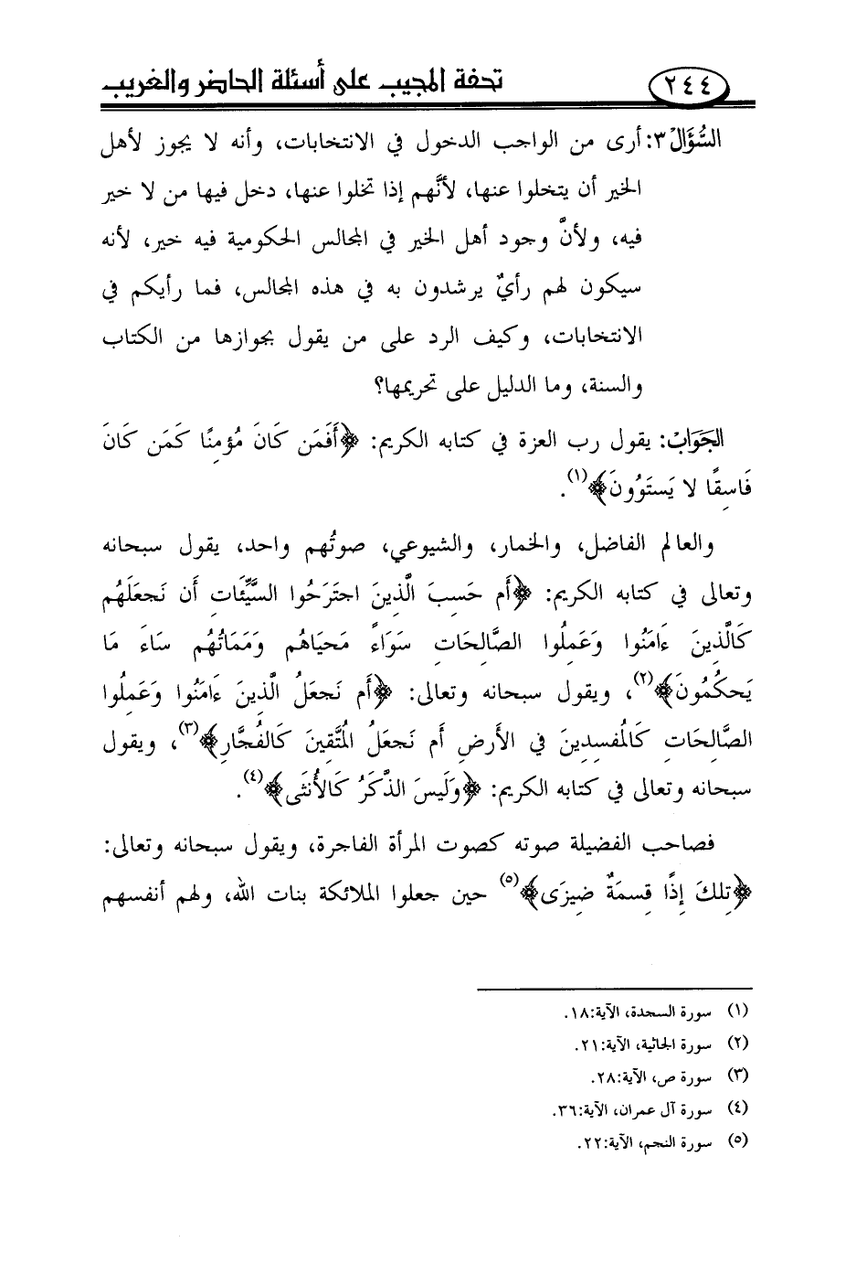 والعالم الفاضل، والخمار، والشيوعي، صوتهم واحد، يقول سبحانه وتعالى في كتابه الكريم: {أم حسب الّذين اجترحوا السّيّئات أن نجعلهم كالّذين ءامنوا وعملوا الصّالحات سواءً محياهم ومماتهم ساء ما يحكمون (¬2)}، ويقول سبحانه وتعالى: {أم نجعل الّذين ءامنوا وعملوا الصّالحات كالمفسدين في الأرض أم نجعل المتّقين كالفجّار (¬3)}، ويقول سبحانه وتعالى في كتابه الكريم: {وليس الذّكر كالأنثى (¬4)}.