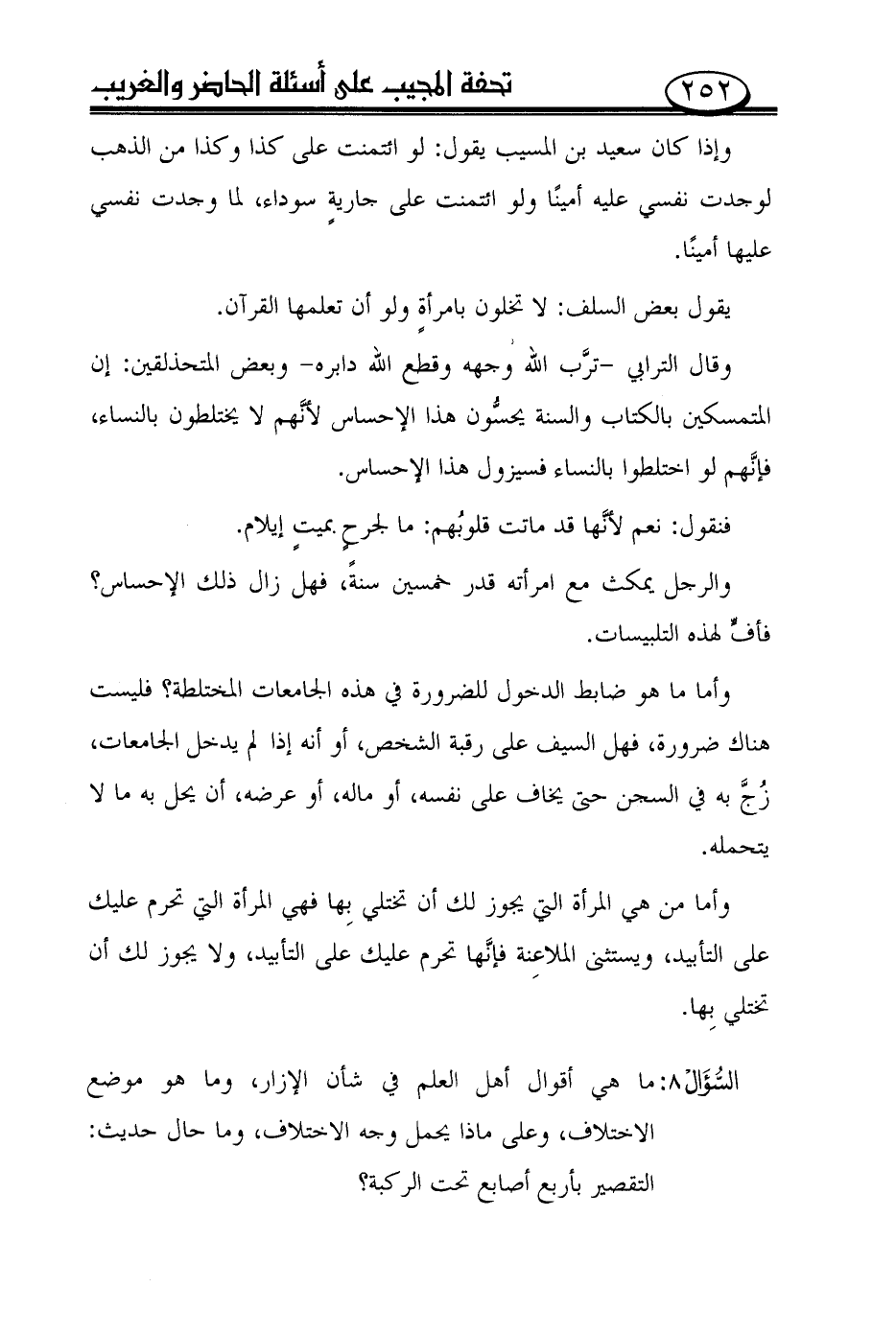 وقال الترابي -ترّب الله وجهه وقطع الله دابره- وبعض المتحذلقين: إن المتمسكين بالكتاب والسنة يحسّون هذا الإحساس لأنّهم لا يختلطون بالنساء، فإنّهم لو اختلطوا بالنساء فسيزول هذا الإحساس.