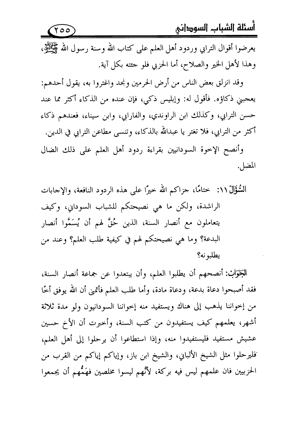 السؤال208: ختامًا، جزاكم الله خيرًا على هذه الردود النافعة، والإجابات الراشدة، ولكن ما هي نصيحتكم للشباب السوداني، وكيف يتعاملون مع أنصار السنة، الذين حقّ لهم أن يسمّوا أنصار البدعة؟ وما هي نصيحتكم لهم في كيفية طلب العلم؟ وعند من يطلبونه؟