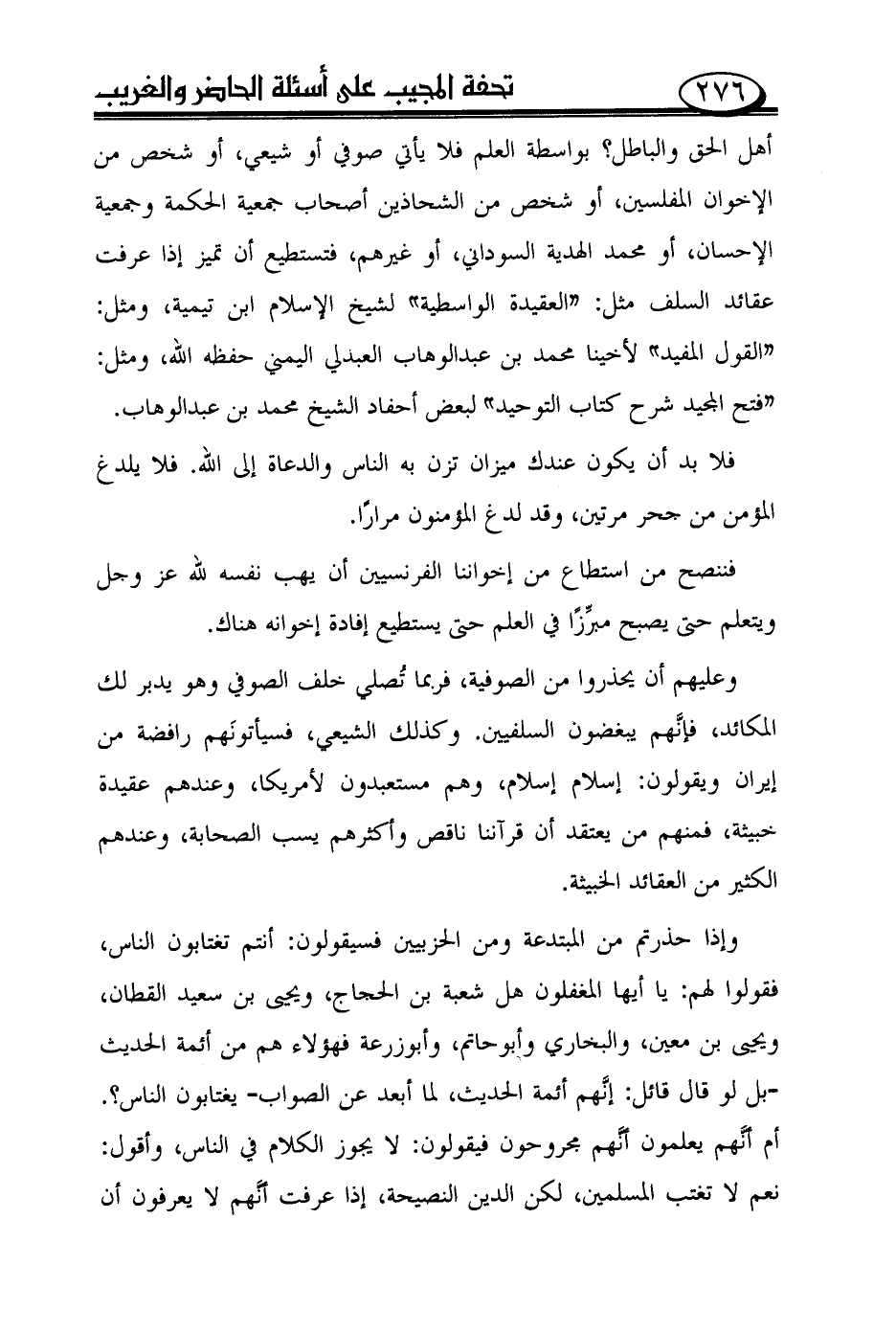 وإذا حذرتم من المبتدعة ومن الحزبيين فسيقولون: أنتم تغتابون الناس، فقولوا لهم: يا أيها المغفلون هل شعبة بن الحجاج، ويحيى بن سعيد القطان، ويحيى بن معين، والبخاري وأبوحاتم، وأبوزرعة فهؤلاء هم من أئمة الحديث بل لو قال قائل: إنّهم أئمة الحديث، لما أبعد عن الصواب يغتابون الناس؟. أم أنّهم يعلمون أنّهم مجروحون فيقولون: لا يجوز الكلام في الناس، وأقول: نعم لا تغتب المسلمين، لكن الدين النصيحة، إذا عرفت أنّهم لا يعرفون أن