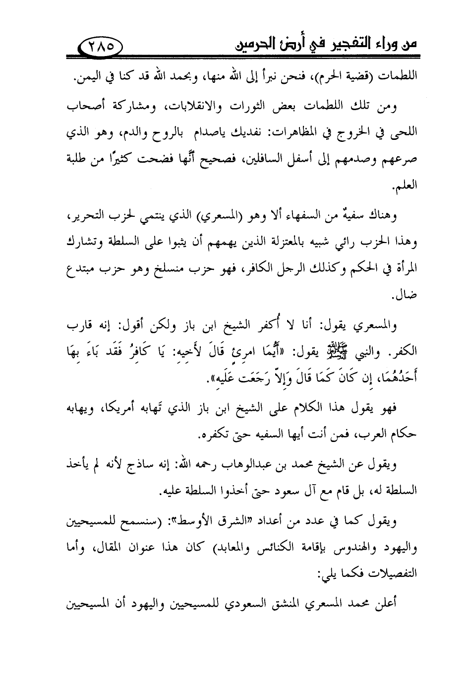 وهناك سفيه من السفهاء ألا وهو (المسعري) الذي ينتمي لحزب التحرير، وهذا الحزب رائي شبيه بالمعتزلة الذين يهمهم أن يثبوا على السلطة وتشارك المرأة في الحكم وكذلك الرجل الكافر، فهو حزب منسلخ وهو حزب مبتدع ضال.