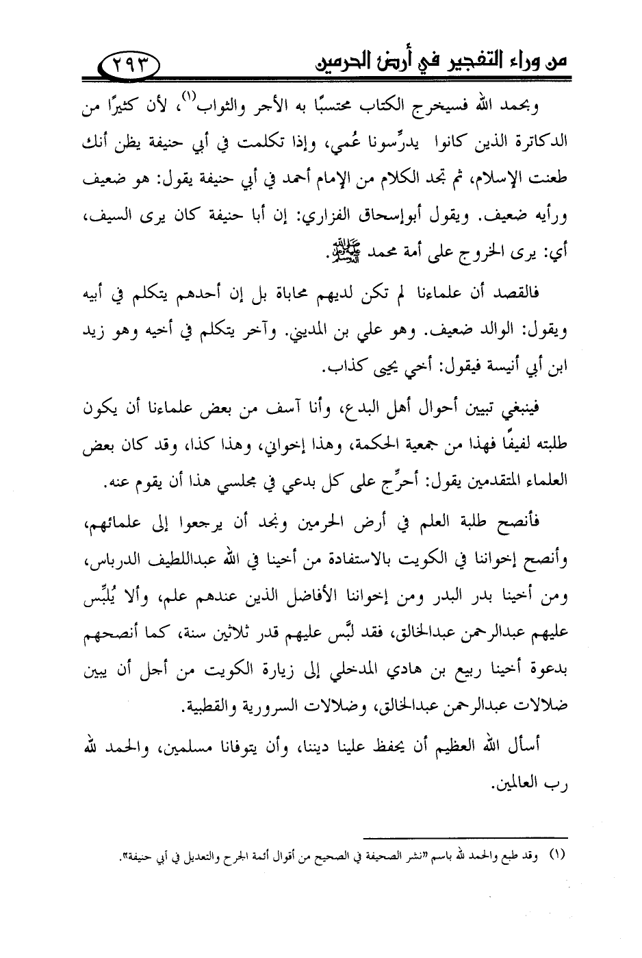 وبحمد الله فسيخرج الكتاب محتسبًا به الأجر والثواب (¬1)، لأن كثيرًا من الدكاترة الذين كانوا يدرّسونا عمي، وإذا تكلمت في أبي حنيفة يظن أنك طعنت الإسلام، ثم تجد الكلام من الإمام أحمد في أبي حنيفة يقول: هو ضعيف ورأيه ضعيف. ويقول أبوإسحاق الفزاري: إن أبا حنيفة كان يرى السيف، أي: يرى الخروج على أمة محمد صلى الله عليه وعلى آله وسلم.