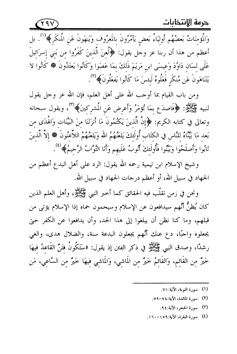 ومن باب القيام بما أوجب الله على أهل العلم، فإن الله عز وجل يقول لنبيه صلى الله عليه وعلى آله وسلم: {فاصدع بما تؤمر وأعرض عن المشركين (¬3)}، ويقول سبحانه وتعالى في كتابه الكريم: {إنّ الّذين يكتمون ما أنزلنا من البيّنات والهدى من بعد ما بيّنّاه للنّاس في الكتاب أولئك يلعنهم الله ويلعنهم اللاّعنون إلاّ الّذين تابوا وأصلحوا وبيّنوا فأولئك أتوب عليهم وأنا التّوّاب الرّحيم (¬4)}.
