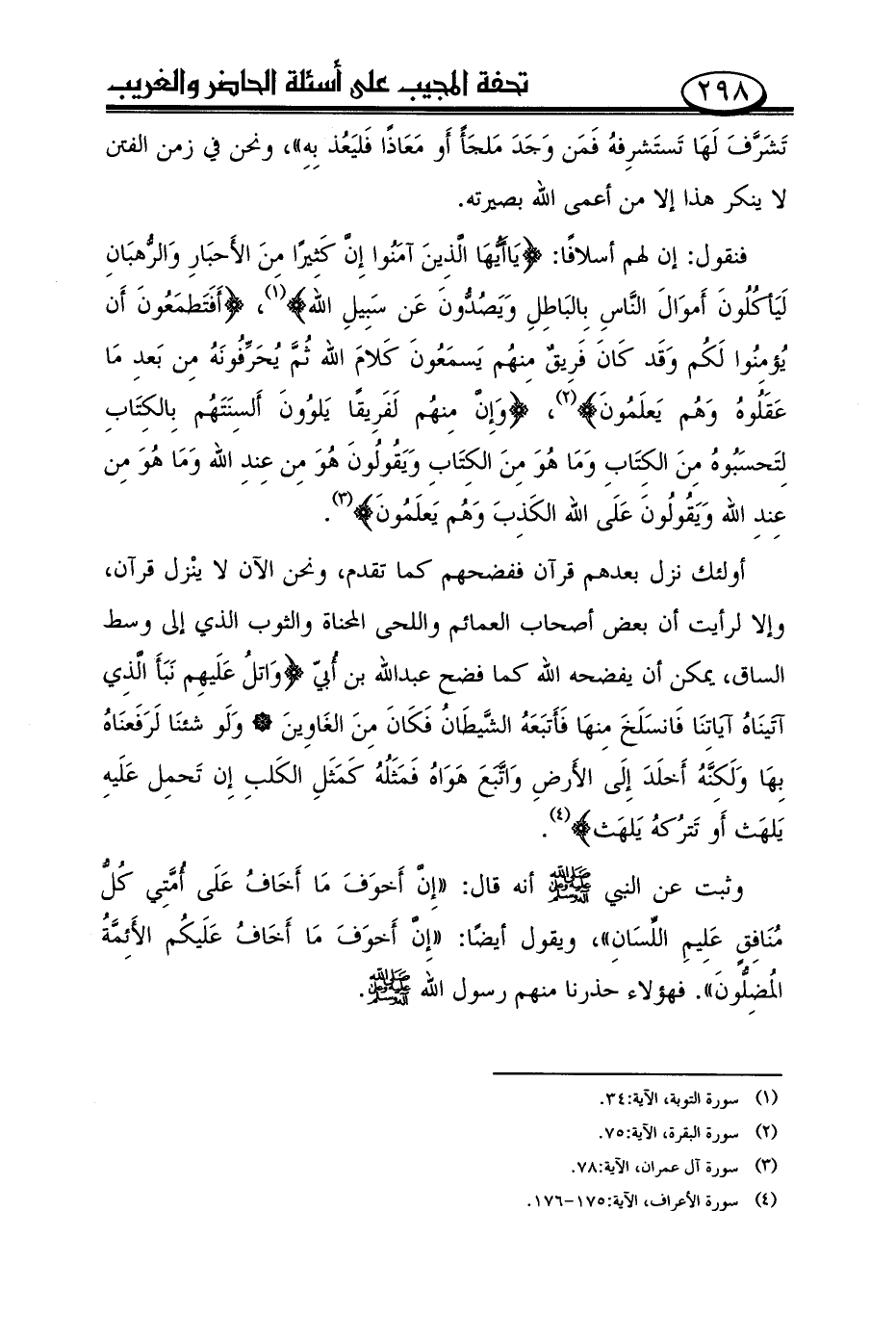 فنقول: إن لهم أسلافًا: {ياأيّها الّذين آمنوا إنّ كثيرًا من الأحبار والرّهبان ليأكلون أموال النّاس بالباطل ويصدّون عن سبيل الله (¬1)}، {أفتطمعون أن يؤمنوا لكم وقد كان فريق منهم يسمعون كلام الله ثمّ يحرّفونه من بعد ما عقلوه وهم يعلمون (¬2)}، {وإنّ منهم لفريقًا يلوون ألسنتهم بالكتاب لتحسبوه من الكتاب وما هو من الكتاب ويقولون هو من عند الله وما هو من عند الله ويقولون على الله الكذب وهم يعلمون (¬3)}.