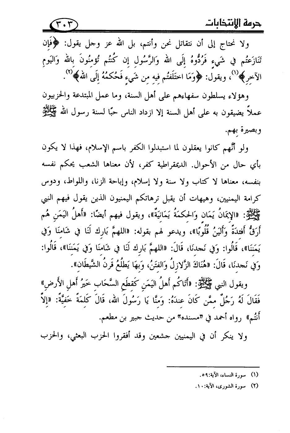ولو أنّهم كانوا يعقلون لما استبدلوا الكفر باسم الإسلام، فهذا لا يكون بأي حال من الأحوال. الديمقراطية كفر، لأن معناها الشعب يحكم نفسه بنفسه، معناها لا كتاب ولا سنة ولا إسلام، وإباحة الزنا، واللواط، ودوس كرامة اليمنيين، وهيهات أن يقبل ترهاتكم اليمنيون الذين يقول فيهم النبي صلى الله عليه وعلى آله وسلم: ((الإيمان يمان والحكمة يمانية))، ويقول فيهم أيضًا: ((أهل اليمن هم أرقّ أفئدةً وألين قلوبًا))، ويدعو لهم بقوله: ((اللهمّ بارك لنا في شامنا وفي يمننا))، قالوا: وفي نجدنا، قال: ((اللهمّ بارك لنا في شامنا وفي يمننا))، قالوا: وفي نجدنا، قال: ((هناك الزّلازل والفتن، وبها يطلع قرن الشّيطان)).