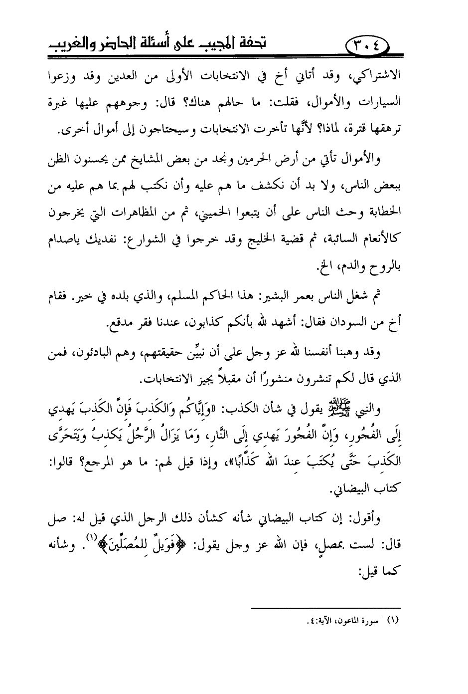 وأقول: إن كتاب البيضاني شأنه كشأن ذلك الرجل الذي قيل له: صل قال: لست بمصل، فإن الله عز وجل يقول: {فويل للمصلّين (¬1)}. وشأنه كما قيل: