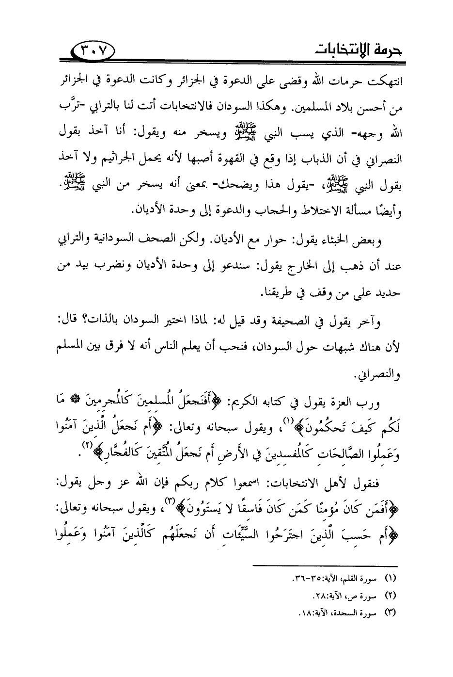 فنقول لأهل الانتخابات: اسمعوا كلام ربكم فإن الله عز وجل يقول: {أفمن كان مؤمنًا كمن كان فاسقًا لا يستوون (¬3)}، ويقول سبحانه وتعالى: {أم حسب الّذين اجترحوا السّيّئات أن نجعلهم كالّذين آمنوا وعملوا