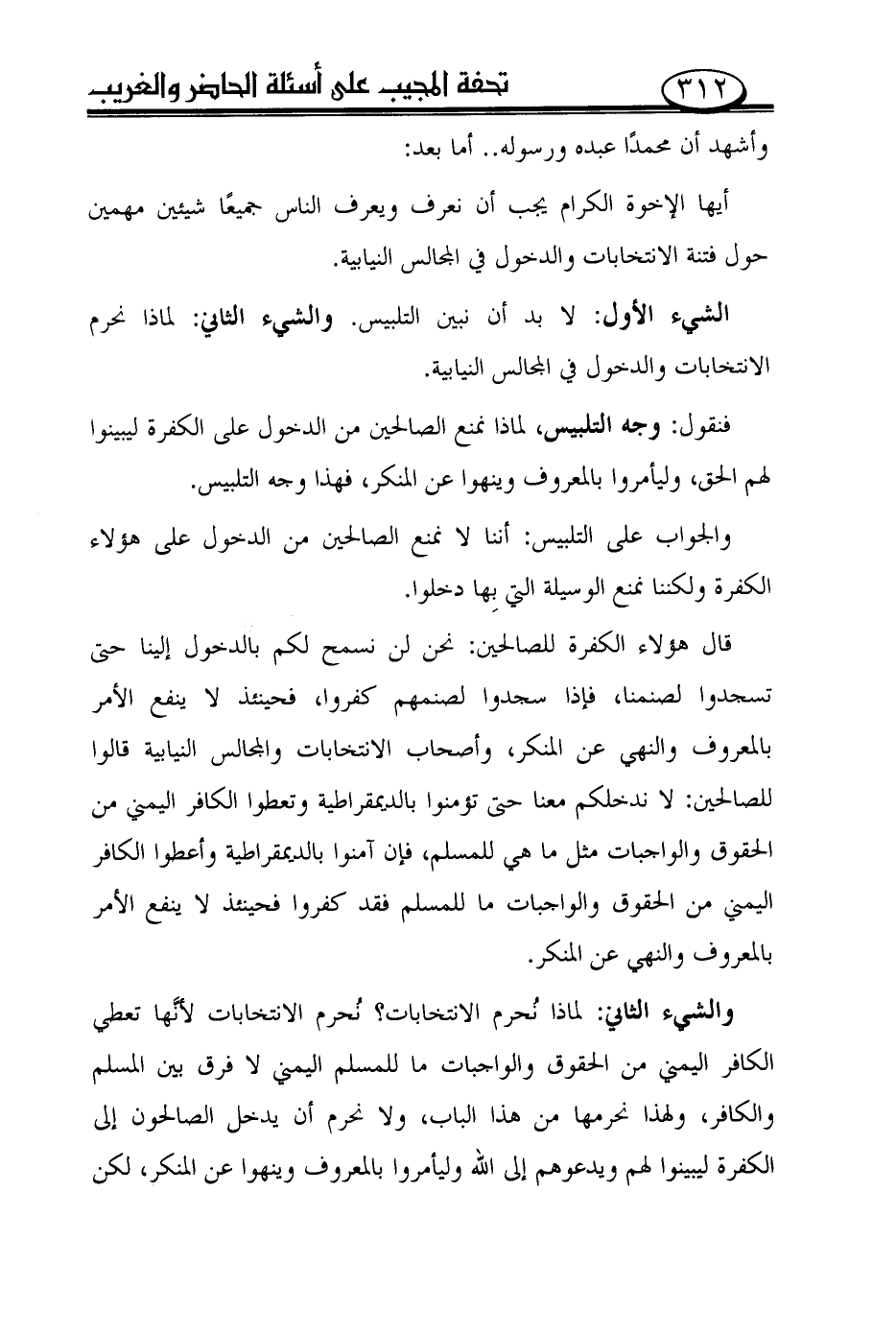 الشيء الأول: لا بد أن نبين التلبيس. والشيء الثاني: لماذا نحرم الانتخابات والدخول في المجالس النيابية.