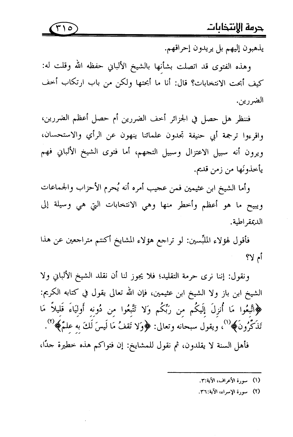 وهذه الفتوى قد اتصلت بشأنها بالشيخ الألباني حفظه الله وقلت له: كيف أبحت الانتخابات؟ قال: أنا ما أبحتها ولكن من باب ارتكاب أخف الضررين.