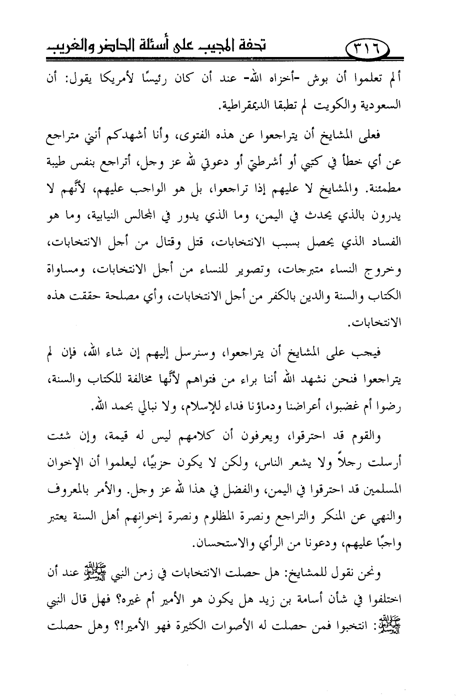 فعلى المشايخ أن يتراجعوا عن هذه الفتوى، وأنا أشهدكم أنني متراجع عن أي خطأ في كتبي أو أشرطتي أو دعوتي لله عز وجل، أتراجع بنفس طيبة مطمئنة. والمشايخ لا عليهم إذا تراجعوا، بل هو الواجب عليهم، لأنّهم لا يدرون بالذي يحدث في اليمن، وما الذي يدور في المجالس النيابية، وما هو الفساد الذي يحصل بسبب الانتخابات، قتل وقتال من أجل الانتخابات، وخروج النساء متبرجات، وتصوير للنساء من أجل الانتخابات، ومساواة الكتاب والسنة والدين بالكفر من أجل الانتخابات، وأي مصلحة حققت هذه الانتخابات.