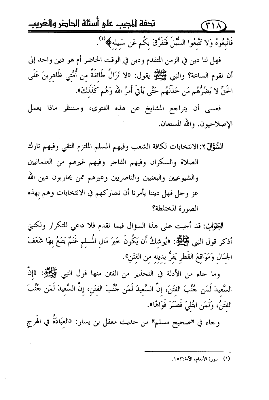 الجواب: قد أجبت على هذا السؤال فيما تقدم فلا داعي للتكرار ولكنني أذكر قول النبي صلى الله عليه وعلى آله وسلم: ((يوشك أن يكون خير مال المسلم غنم يتبع بها شعف الجبال ومواقع القطر يفرّ بدينه من الفتن)).