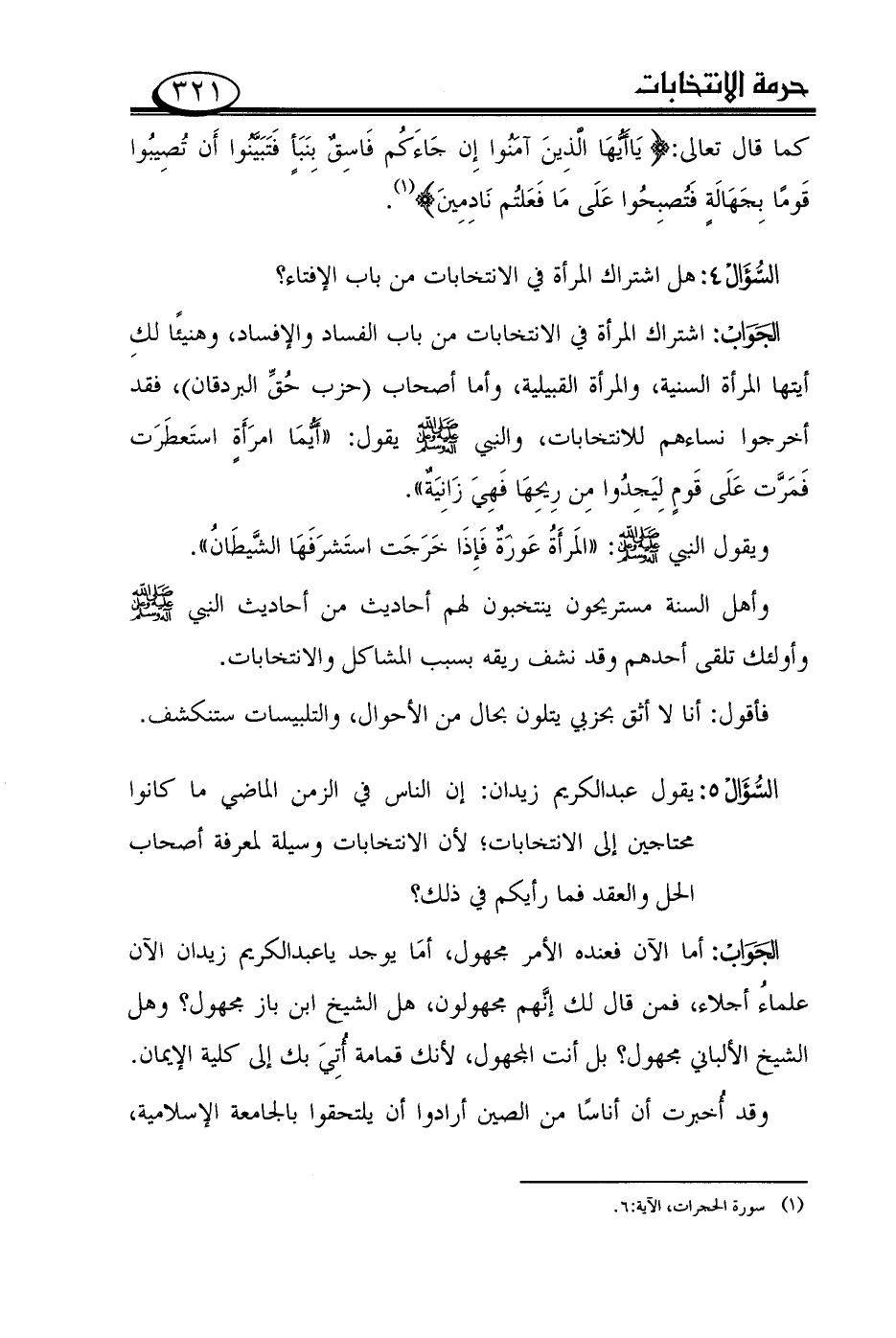 الجواب: اشتراك المرأة في الانتخابات من باب الفساد والإفساد، وهنيئًا لك أيتها المرأة السنية، والمرأة القبيلية، وأما أصحاب (حزب حقّ البردقان)، فقد أخرجوا نساءهم للانتخابات، والنبي صلى الله عليه وعلى آله وسلم يقول: ((أيّما امرأة استعطرت فمرّت على قوم ليجدوا من ريحها فهي زانية)).