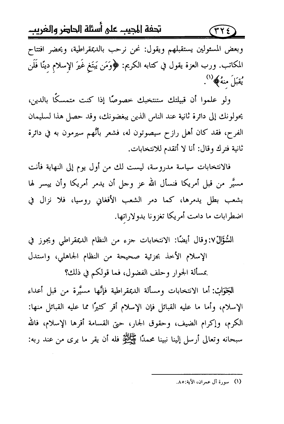 وبعض المسئولين يستقبلهم ويقول: نحن نرحب بالديمقراطية، ويحضر افتتاح المكاتب. ورب العزة يقول في كتابه الكريم: {ومن يبتغ غير الإسلام دينًا فلن يقبل منه (¬1)}.