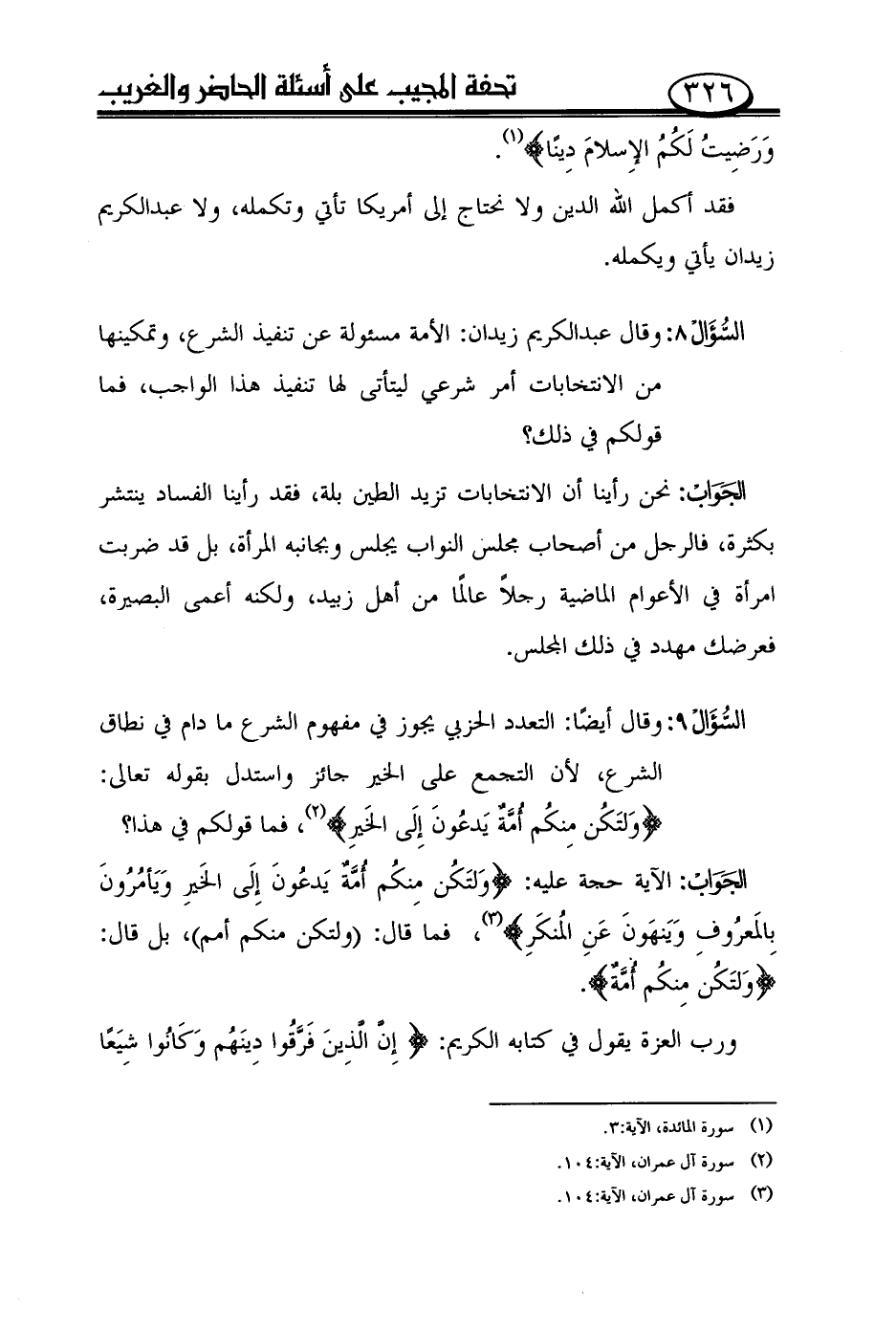 السؤال230: وقال عبد الكريم زيدان: الأمة مسئولة عن تنفيذ الشرع، وتمكينها من الانتخابات أمر شرعي ليتأتى لها تنفيذ هذا الواجب، فما قولكم في ذلك؟