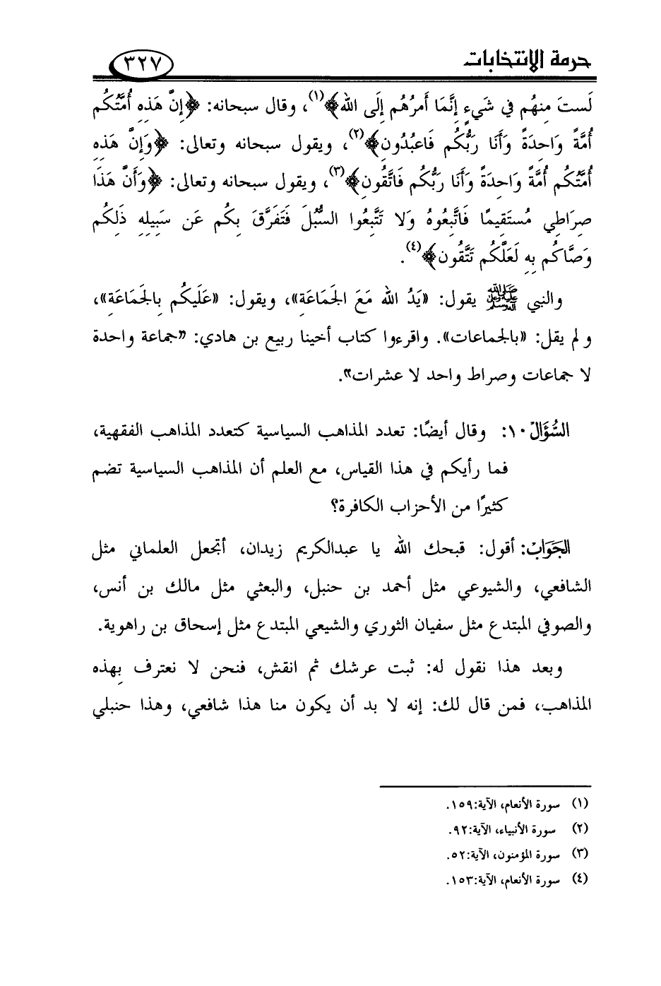 السؤال232: وقال أيضًا: تعدد المذاهب السياسية كتعدد المذاهب الفقهية، فما رأيكم في هذا القياس، مع العلم أن المذاهب السياسية تضم كثيرًا من الأحزاب الكافرة؟
