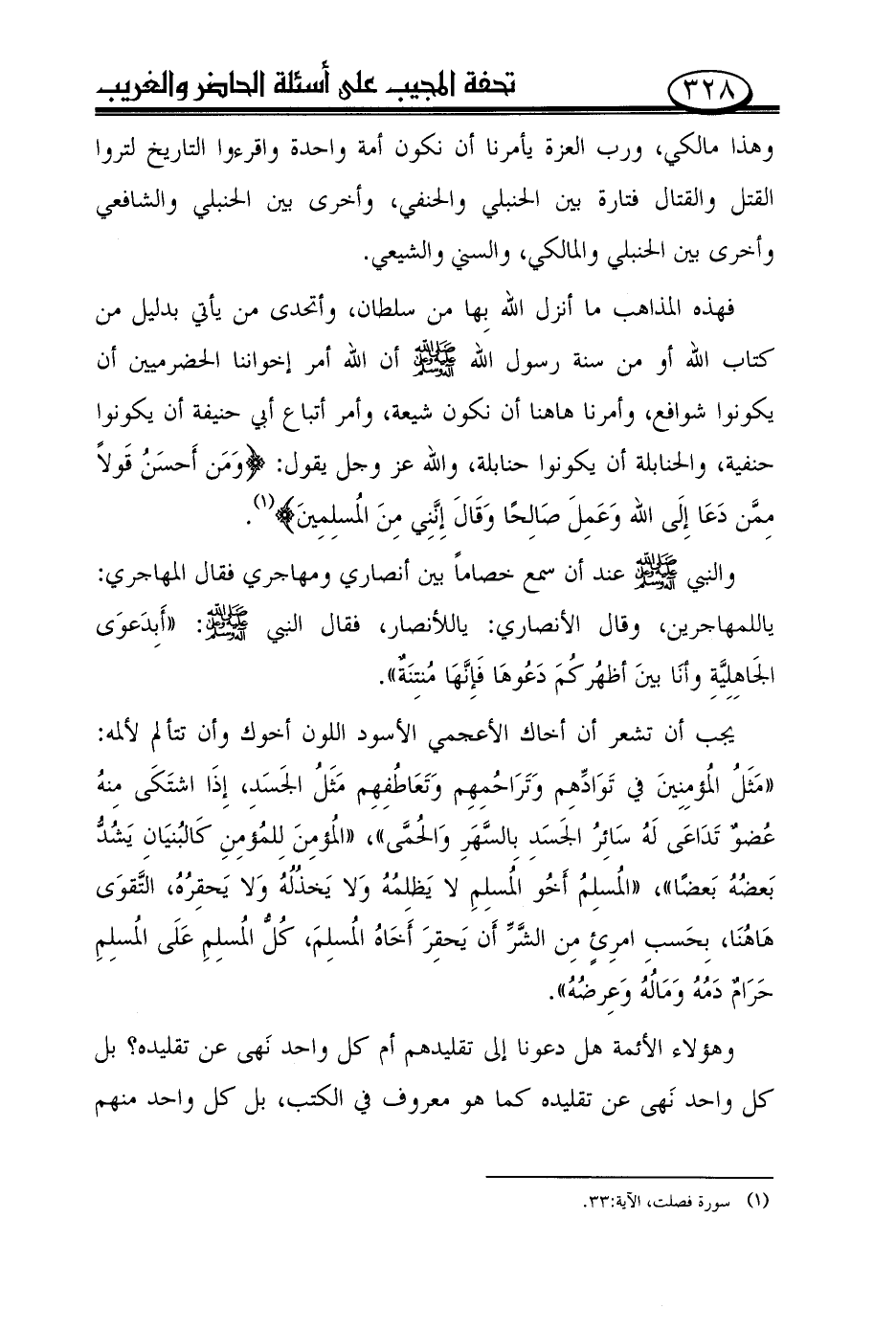 فهذه المذاهب ما أنزل الله بها من سلطان، وأتحدى من يأتي بدليل من كتاب الله أو من سنة رسول الله صلى الله عليه وعلى آله وسلم أن الله أمر إخواننا الحضرميين أن يكونوا شوافع، وأمرنا هاهنا أن نكون شيعة، وأمر أتباع أبي حنيفة أن يكونوا حنفية، والحنابلة أن يكونوا حنابلة، والله عز وجل يقول: {ومن أحسن قولاً ممّن دعا إلى الله وعمل صالحًا وقال إنّني من المسلمين (¬1)}.