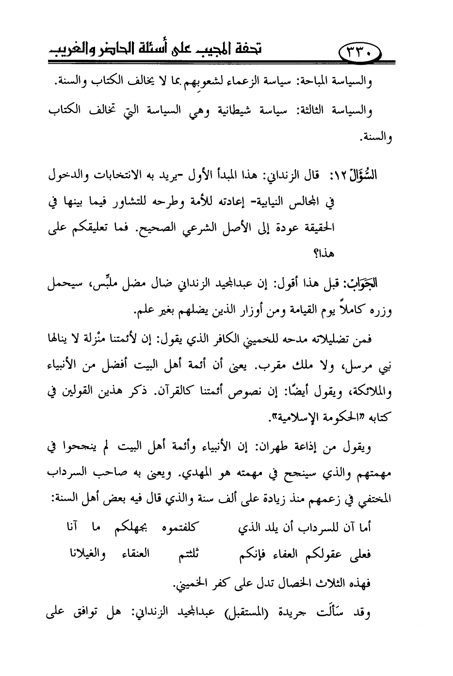 السؤال234: قال الزنداني: هذا المبدأ الأول يريد به الانتخابات والدخول في المجالس النيابية إعادته للأمة وطرحه للتشاور فيما بينها في الحقيقة عودة إلى الأصل الشرعي الصحيح. فما تعليقكم على هذا؟