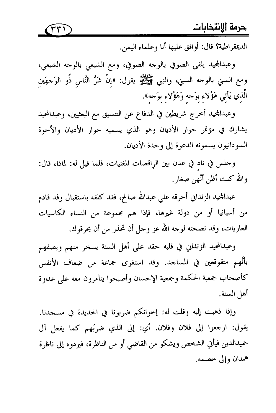 وعبد المجيد يلقى الصوفي بالوجه الصوفي، ومع الشيعي بالوجه الشيعي، ومع السني بالوجه السني، والنبي صلى الله عليه وعلى آله وسلم يقول: ((إنّ شرّ النّاس ذو الوجهين الّذي يأتي هؤلاء بوجه وهؤلاء بوجه)).