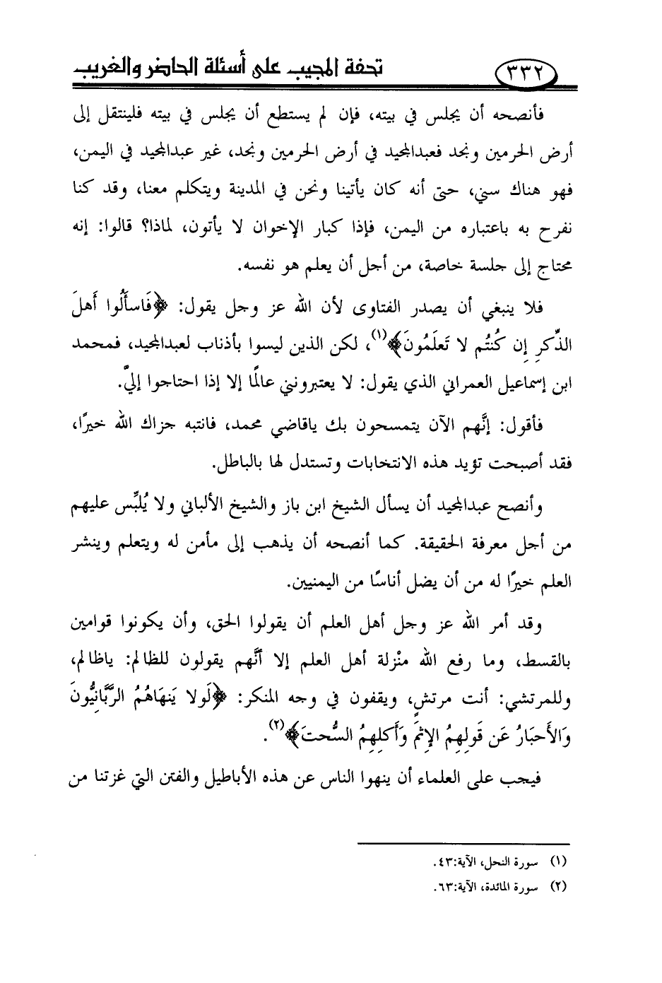 وأنصح عبد المجيد أن يسأل الشيخ ابن باز والشيخ الألباني ولا يلبّس عليهم من أجل معرفة الحقيقة. كما أنصحه أن يذهب إلى مأمن له ويتعلم وينشر العلم خيرًا له من أن يضل أناسًا من اليمنيين.