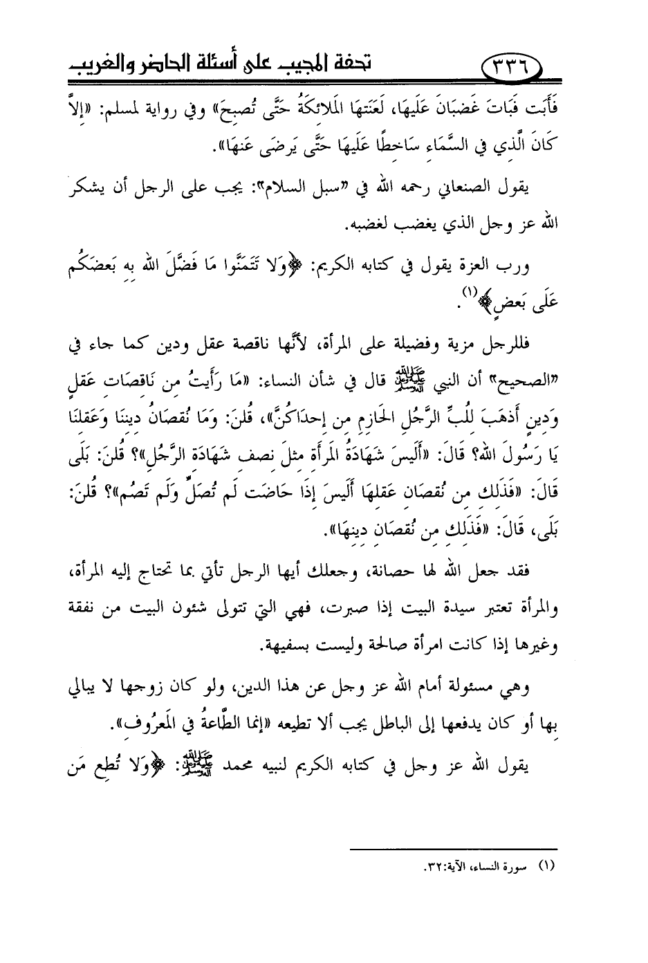 فللرجل مزية وفضيلة على المرأة، لأنّها ناقصة عقل ودين كما جاء في "الصحيح" أن النبي صلى الله عليه وعلى آله وسلم قال في شأن النساء: ((ما رأيت من ناقصات عقل ودين أذهب للبّ الرّجل الحازم من إحداكنّ))، قلن: وما نقصان ديننا وعقلنا يا رسول الله؟ قال: ((أليس شهادة المرأة مثل نصف شهادة الرّجل))؟ قلن: بلى قال: ((فذلك من نقصان عقلها أليس إذا حاضت لم تصلّ ولم تصم))؟ قلن: بلى، قال: ((فذلك من نقصان دينها)).