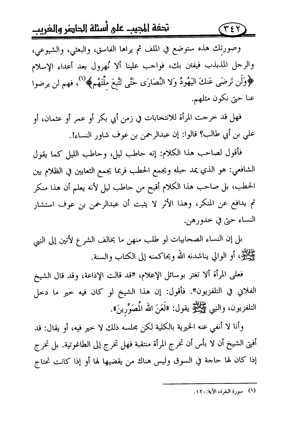 فعلى المرأة ألا تغتر بوسائل الإعلام، "قد قالت الإذاعة، وقد قال الشيخ الفلاني في التلفزيون". فأقول: إن هذا الشيخ لو كان فيه خير ما دخل التلفزيون، والنبي صلى الله عليه وعلى آله وسلم يقول: ((لعن الله المصوّرين)).