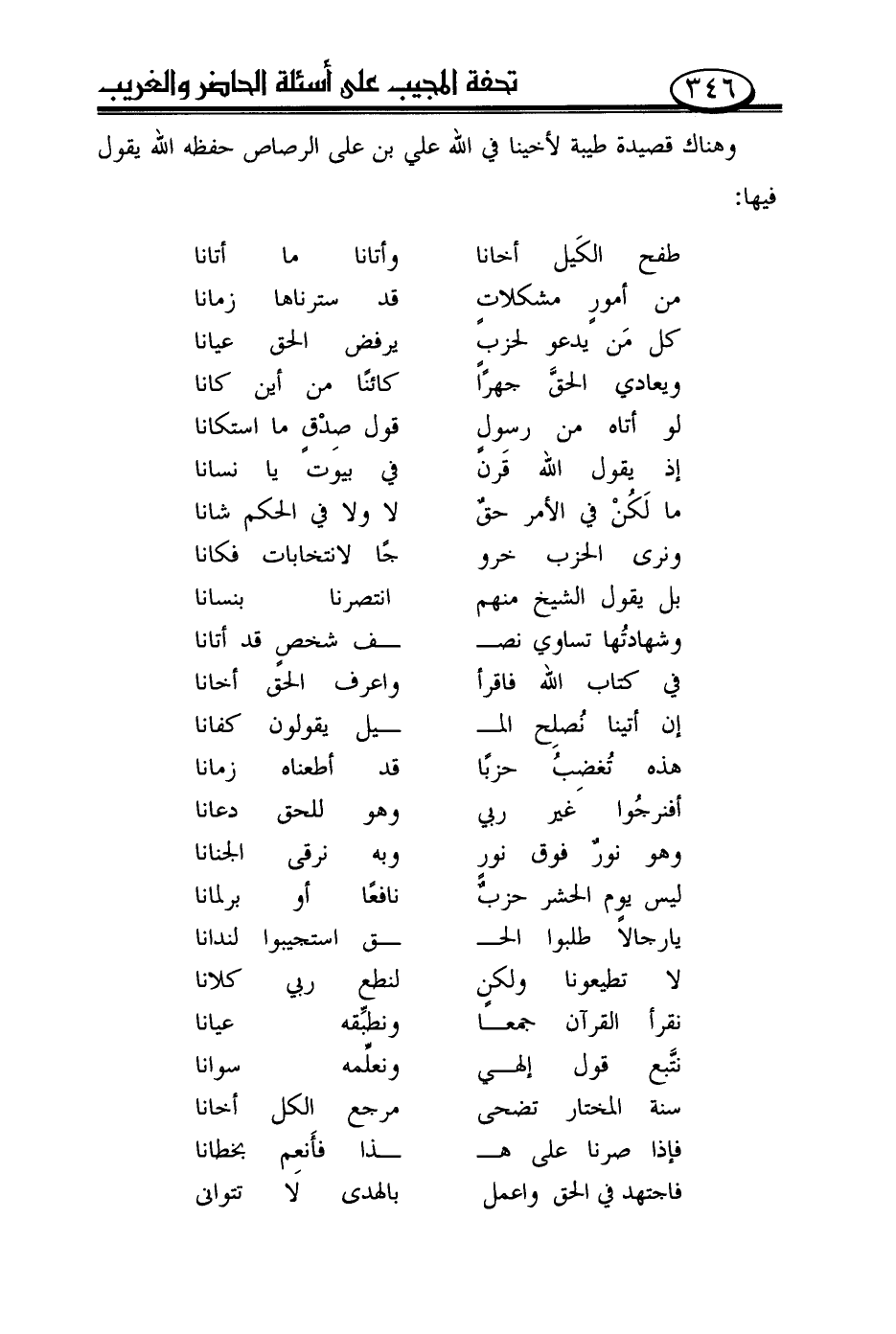 وهناك قصيدة طيبة لأخينا في الله علي بن على الرصاص حفظه الله يقول فيها: