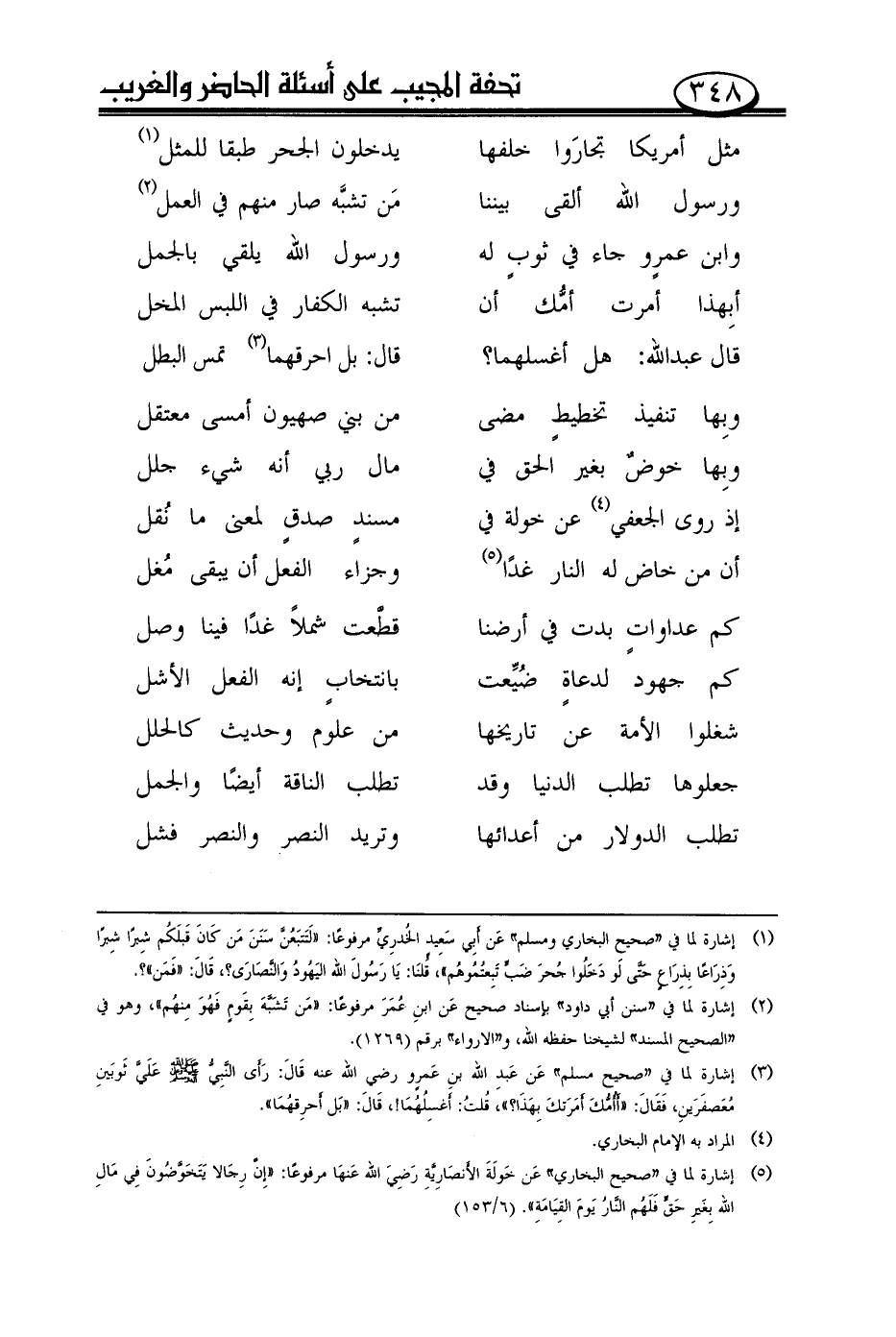 (¬1) إشارة لما في صحيح البخاري ومسلم عَن أَبِي سَعِيدٍ الخُدرِيِّ مرفوعًا: لَتَتبَعُنَّ سَنَنَ مَن كَانَ قَبلَكُم شِبرًا شِبرًا وَذِرَاعًا بِذِرَاعٍ حَتَّى لَو دَخَلُوا جُحرَ ضَبٍّ تَبِعتُمُوهُم، قُلنَا: يَا رَسُولَ الله اليَهُودُ وَالنَّصَارَى؟، قَالَ: "فَمَن"؟.
