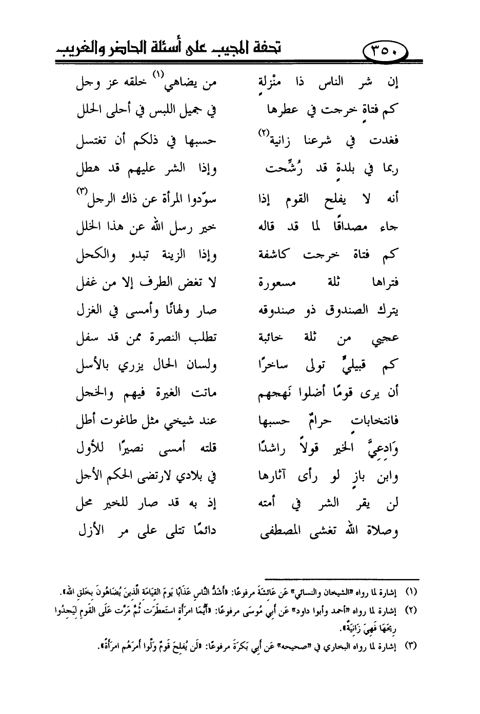 (¬2) إشارة لما رواه أحمد وأبوا داود عَن أَبِي مُوسَى مرفوعًا: أَيُّمَا امرَأَةٍ استَعطَرَت ثُمَّ مَرَّت عَلَى القَومِ لِيَجِدُوا رِيحَهَا فَهِيَ زَانِيَةٌ.
