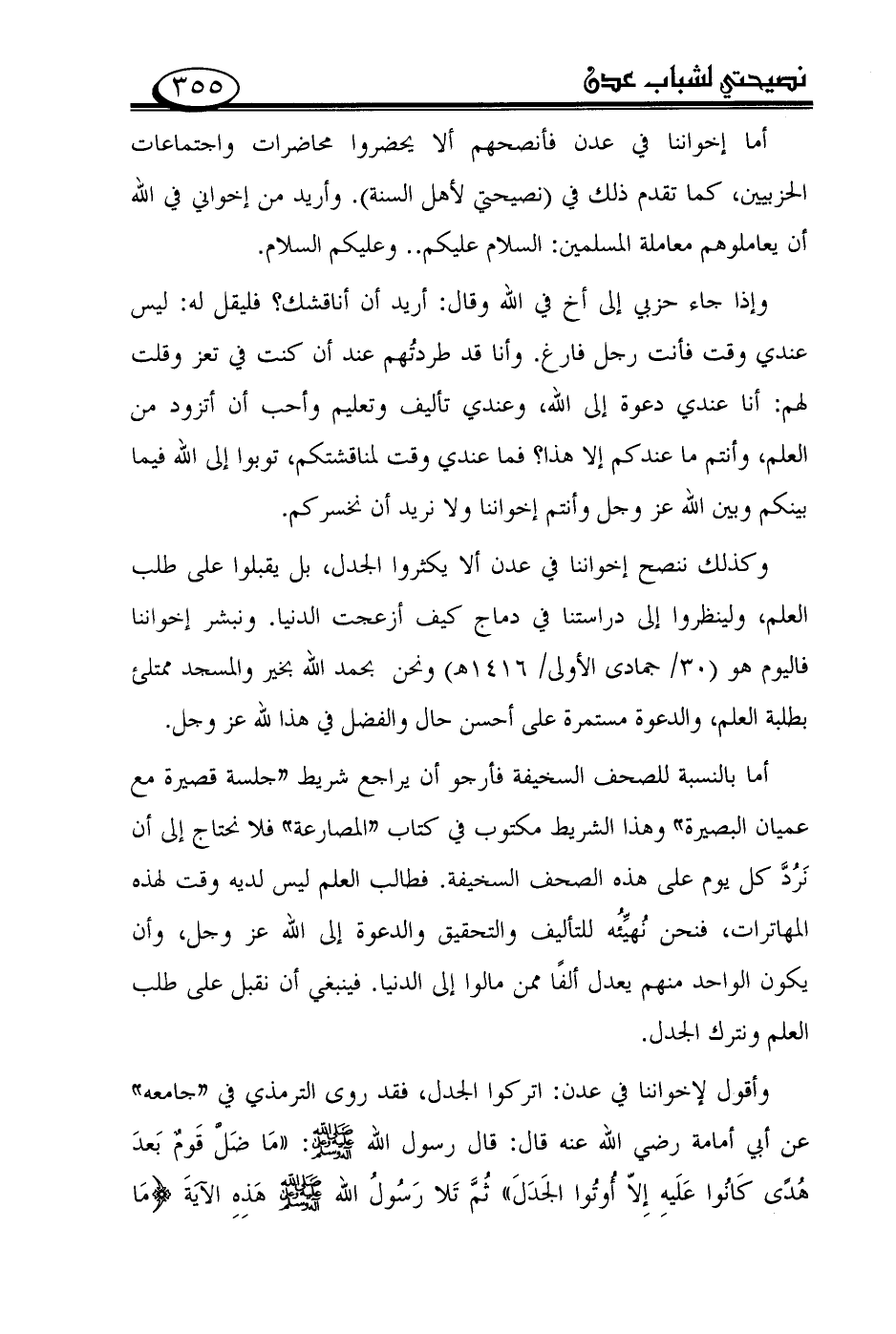 وكذلك ننصح إخواننا في عدن ألا يكثروا الجدل، بل يقبلوا على طلب العلم، ولينظروا إلى دراستنا في دماج كيف أزعجت الدنيا. ونبشر إخواننا فاليوم هو (30/ جمادى الأولى/ 1416) ونحن بحمد الله بخير والمسجد ممتلئ بطلبة العلم، والدعوة مستمرة على أحسن حال والفضل في هذا لله عز وجل.
