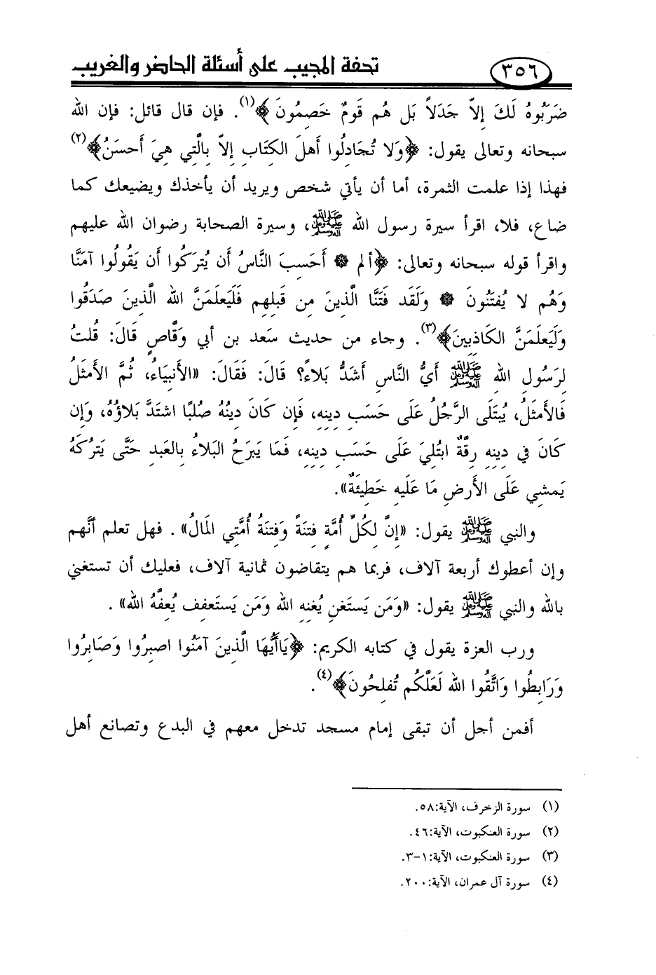 ضربوه لك إلاّ جدلاً بل هم قوم خصمون (¬1)}. فإن قال قائل: فإن الله سبحانه وتعالى يقول: {ولا تجادلوا أهل الكتاب إلاّ بالّتي هي أحسن (¬2)} فهذا إذا علمت الثمرة، أما أن يأتي شخص ويريد أن يأخذك ويضيعك كما ضاع، فلا، اقرأ سيرة رسول الله صلى الله عليه وعلى آله وسلم، وسيرة الصحابة رضوان الله عليهم واقرأ قوله سبحانه وتعالى: {ألم أحسب النّاس أن يتركوا أن يقولوا آمنّا وهم لا يفتنون ولقد فتنّا الّذين من قبلهم فليعلمنّ الله الّذين صدقوا وليعلمنّ الكاذبين (¬3)}. وجاء من حديث سعد بن أبي وقّاص قال: قلت لرسول الله صلى الله عليه وعلى آله وسلم أيّ النّاس أشدّ بلاءً؟ قال: فقال: ((الأنبياء، ثمّ الأمثل فالأمثل، يبتلى الرّجل على حسب دينه، فإن كان دينه صلبًا اشتدّ بلاؤه، وإن كان في دينه رقّة ابتلي على حسب دينه، فما يبرح البلاء بالعبد حتّى يتركه يمشي على الأرض ما عليه خطيئة)).